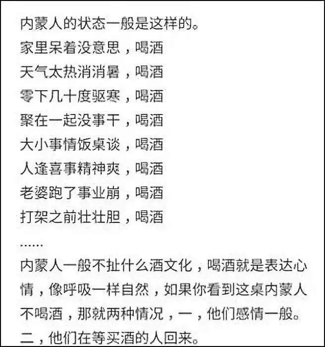 为什么内蒙古朋友这么能喝?我不禁想起了“内蒙古第一孝子”李诞的段子: “为啥我们内蒙古人这么热情?因为寂寞。草原好不容易来两个人,我为啥不热情点?为啥灌你喝酒?就是为了让你喝难受了,陪我呆两天。” 看来,内蒙古人朋友有多喜欢你,就看他灌你多少酒了,就看你醉几天了。 别说了,这都是爱啊,喝吧,朋友们。