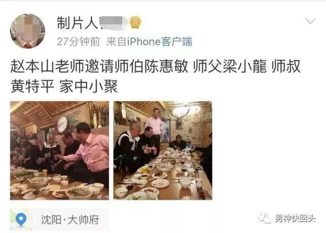 12月24日晚,一位圈内制片人发布了两张聚会照,他的定位是“沈阳大帅府”附近,而照片中的几位大明星,大家应该都很熟悉,但就没有想过他们几位竟然认识。该名制片人说,这一场晚宴,是赵本山老师邀请来自香港的陈惠敏以及梁小龙到家中小聚,不过时间不详。