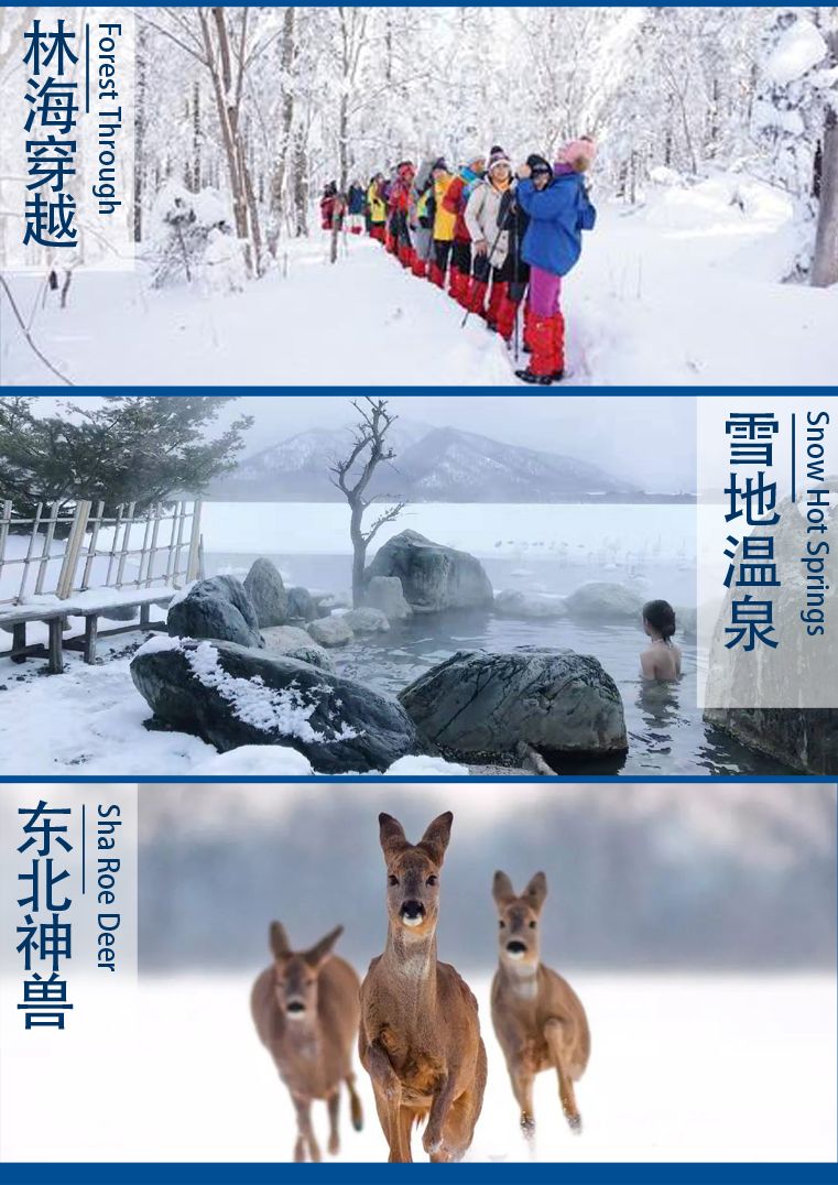 冰天雪地赏玩集结号:【冰雪寒地温泉】【冰凌秘境】【冰雪梦幻灯光秀】【徒步穿越林海雪原】【冰雪画廊】【雪地摩托登龙江第一峰】【雪地长龙】【雪地转转】【雪上悠波球】【云端雪滑梯】