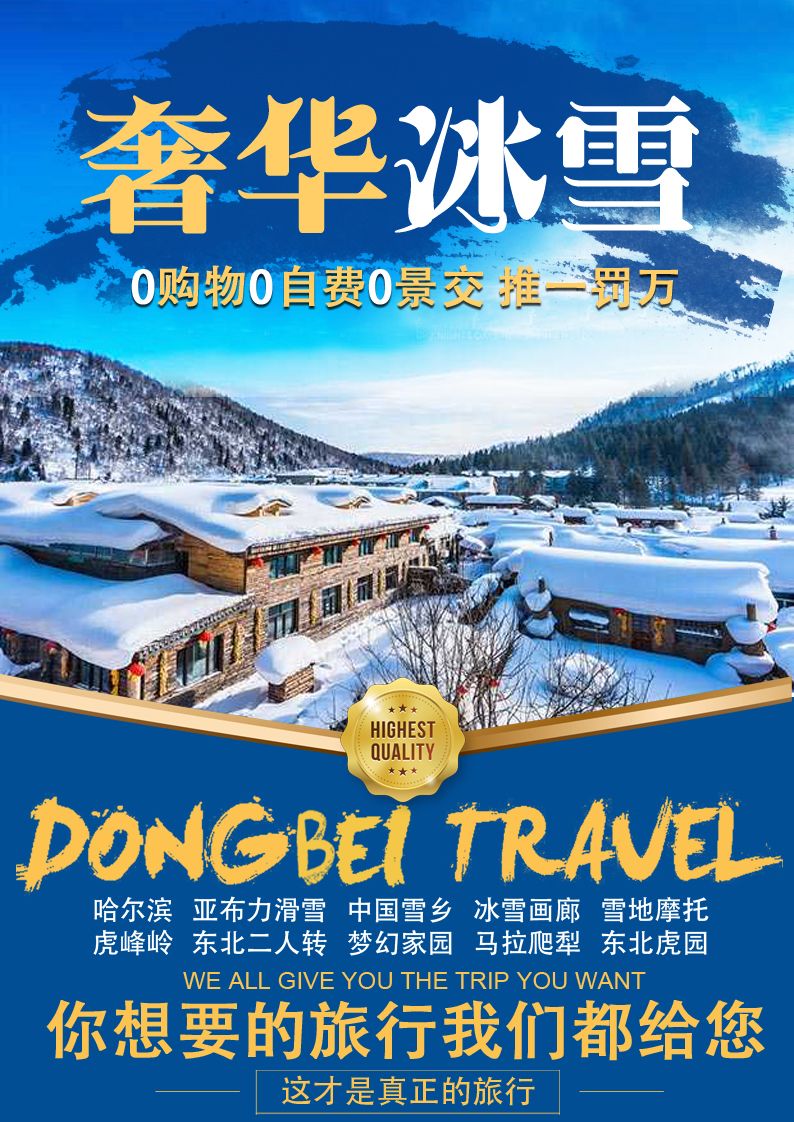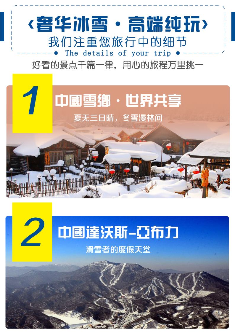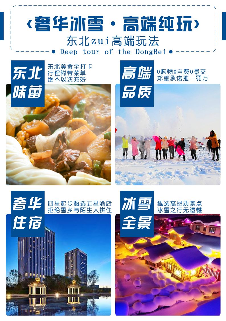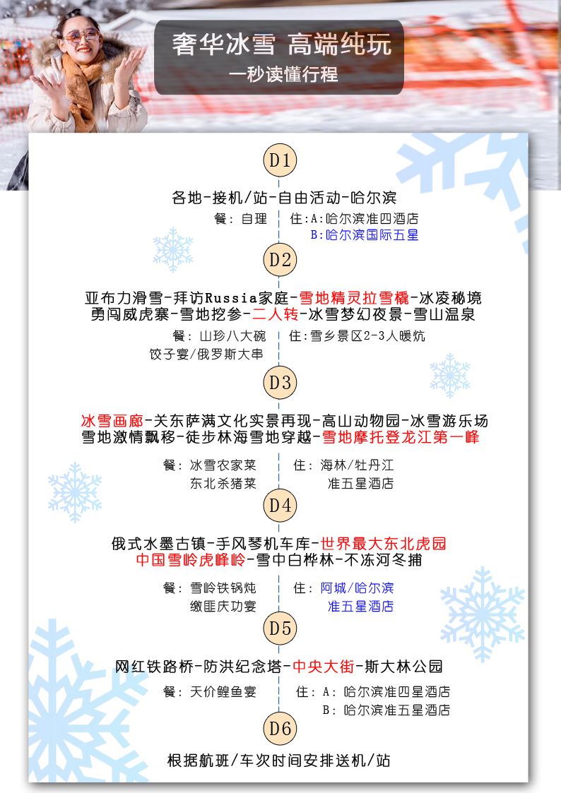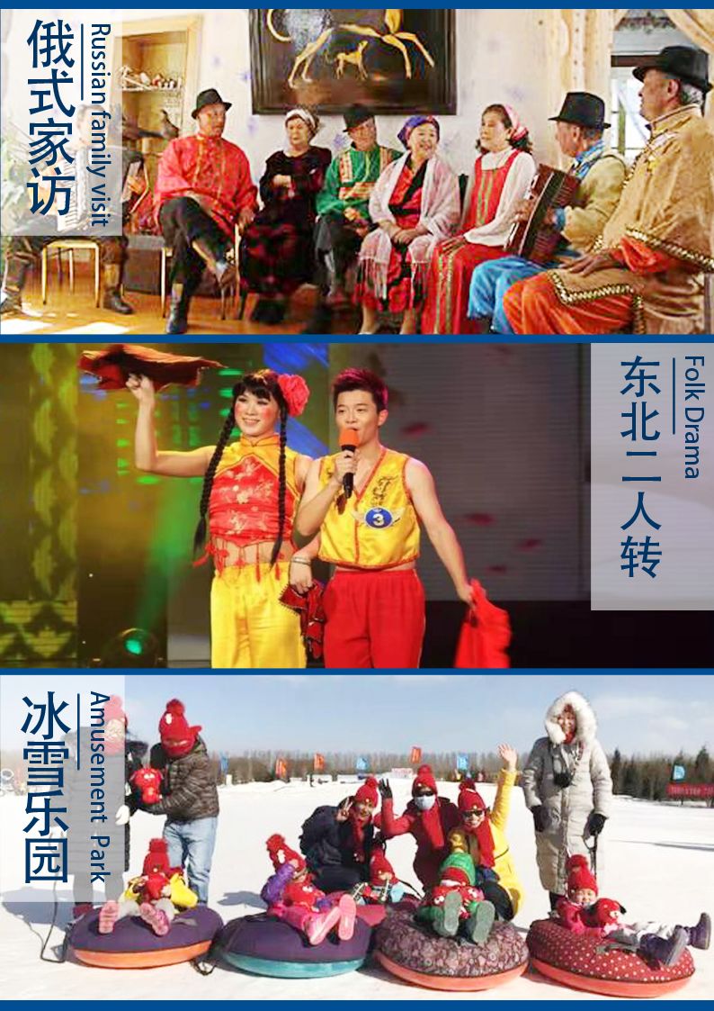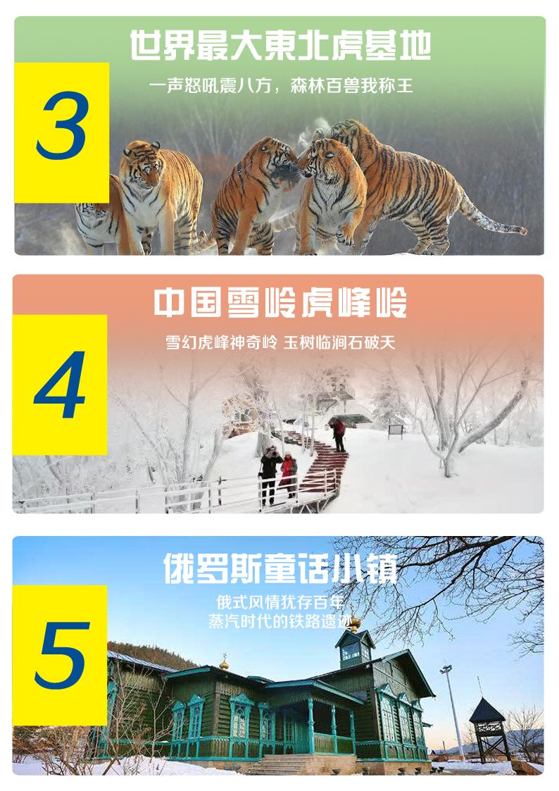 哈尔滨、中国达沃斯滑雪、图瓦人雪地精灵拉雪橇、冰凌秘境、威虎寨、童话雪乡、梦幻家园灯光秀、东北二人转、雪地摩托、龙江第一峰、冰雪画廊、冰雪游乐园、访问俄罗斯华裔家庭、世界最大东北虎园、中国雪岭虎峰岭、寒地温泉五星不带钱包6日游
