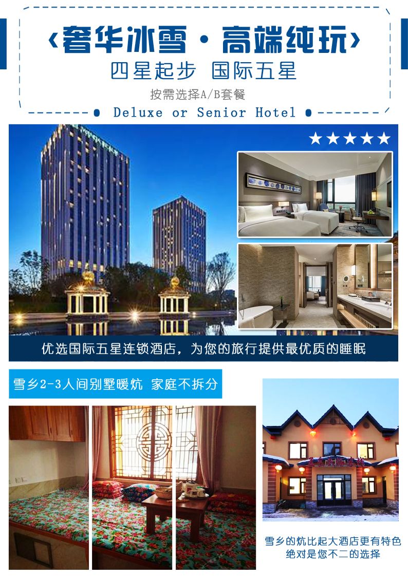 B套餐参考酒店:国际五+准五+雪乡暖炕(房差5天450元/人、6天580元/人 不含雪乡)