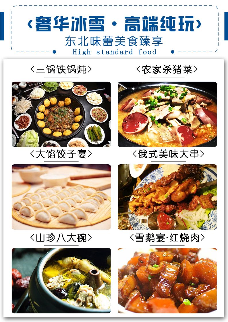 晚餐参考菜单:俄罗斯特色大串、雪乡杀猪菜、滋补小炒、金玉满堂、野菜杂粮包、东北大馅水饺不限量