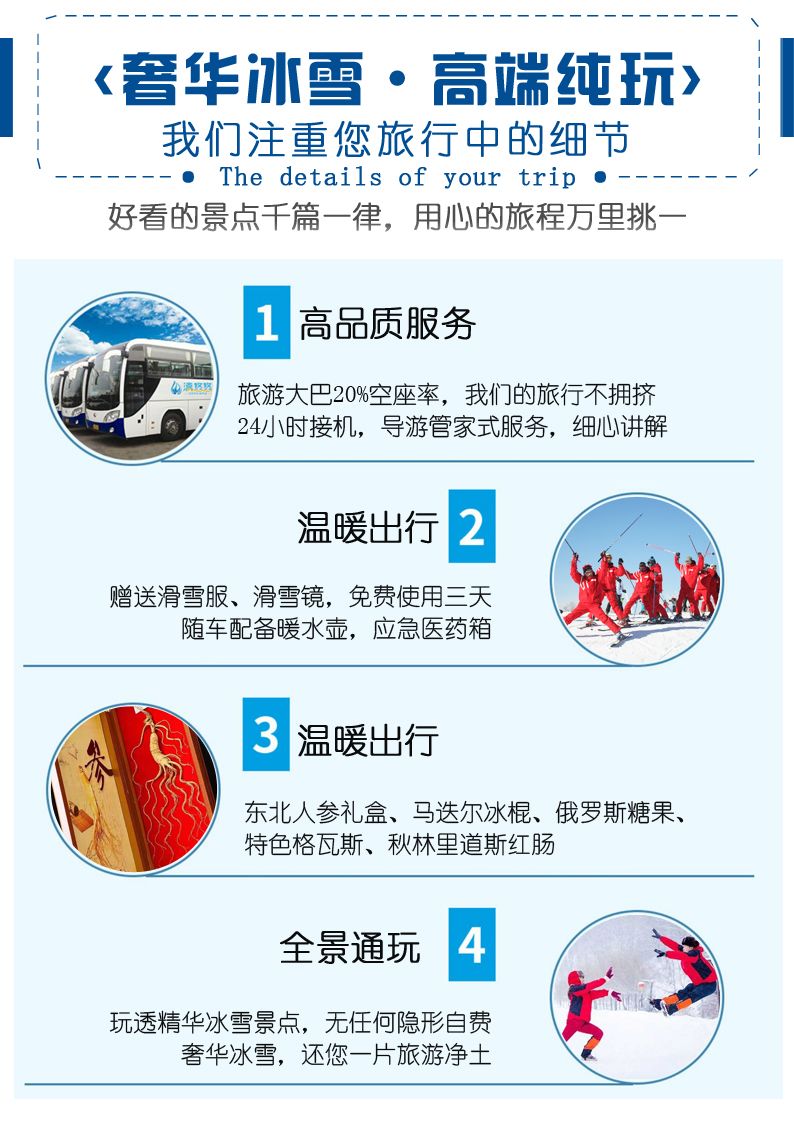 备注:此行程住宿为2晚准五星酒店+1晚准四星酒店+1晚雪乡别墅暖炕。如需升级2晚国际五星酒店+1晚准五星酒店+1晚雪乡别墅暖炕,成人+100元,儿童不变。