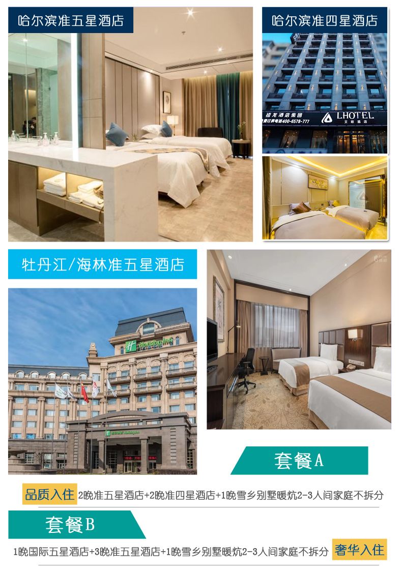 A套餐参考酒店:准四+准五+雪乡暖炕(房差5天400元/人、6天450元 不含雪乡)