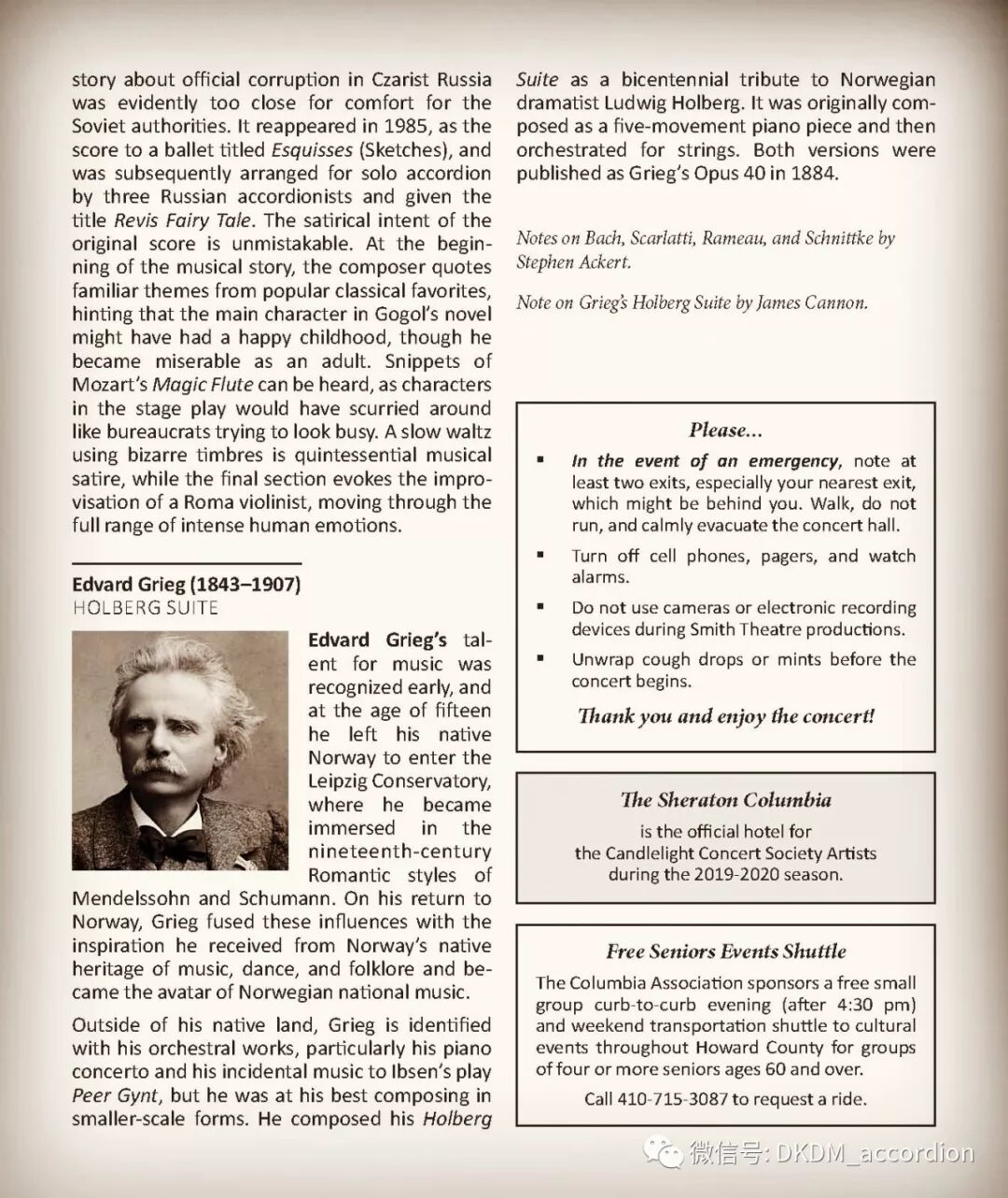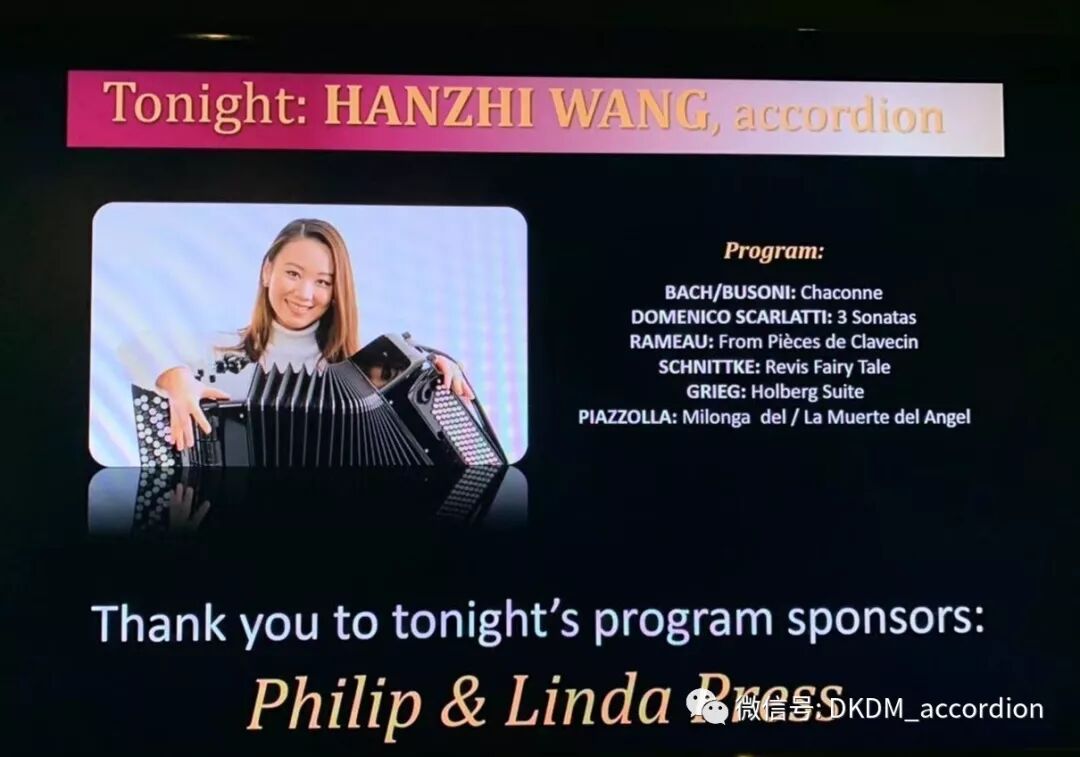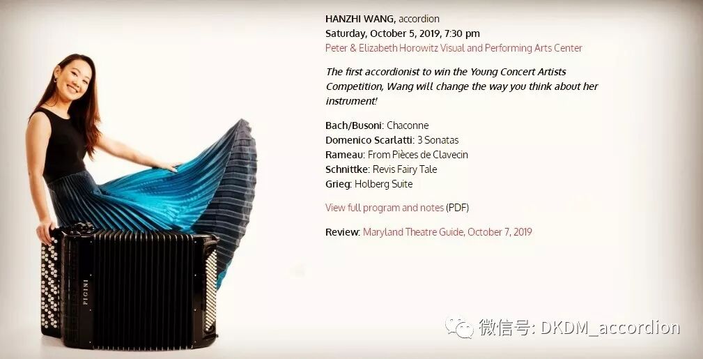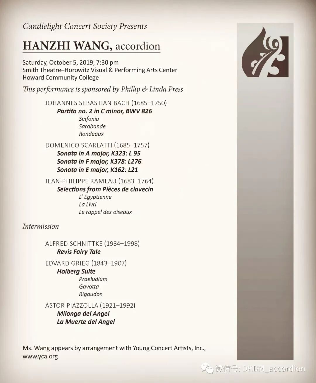 10月5日,星期六,马里兰州哥伦比亚市霍洛维茨视觉与表演艺术中心(Horowitz Visual and Performing Arts Center),王寒之2019-2020美国秋季巡演第四站手风琴独奏音乐会及青少年音乐教育讲座在此成功举办,该场活动由烛光音乐会协会(Candlelight Concert Society)主办。