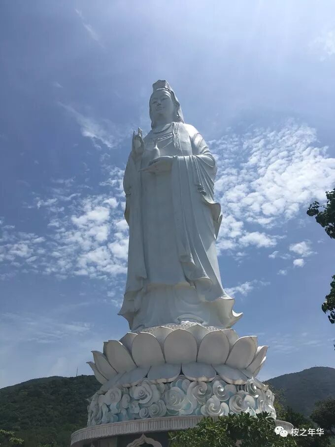 想打车去山茶半岛,grab上找不到具体地址,只好坐了旁边主动来招揽的车。到灵应寺收了300k。还说等我们回来。本来以为我们去的山茶半岛是个岛,结果好像是山,山上就是 东南亚 最高的观音像。据说之前 岘港 经常涨水,修了观音像后就没有发生过水灾了。观音像耸立入云,洁白无瑕,圣洁伟岸的样子,保佑着 岘港 同胞。