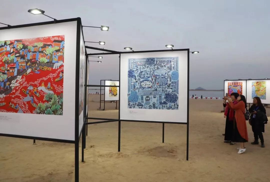 据了解,此次画展开幕式在城市沙滩举办也是一次创新之举,打破原来传统画展展览展示模式,以一种全新的方式向嘉宾、游客诠释农民画的独特魅力,海浪、沙滩、帆船、农民画,融合成为一道靓丽的风景线。
