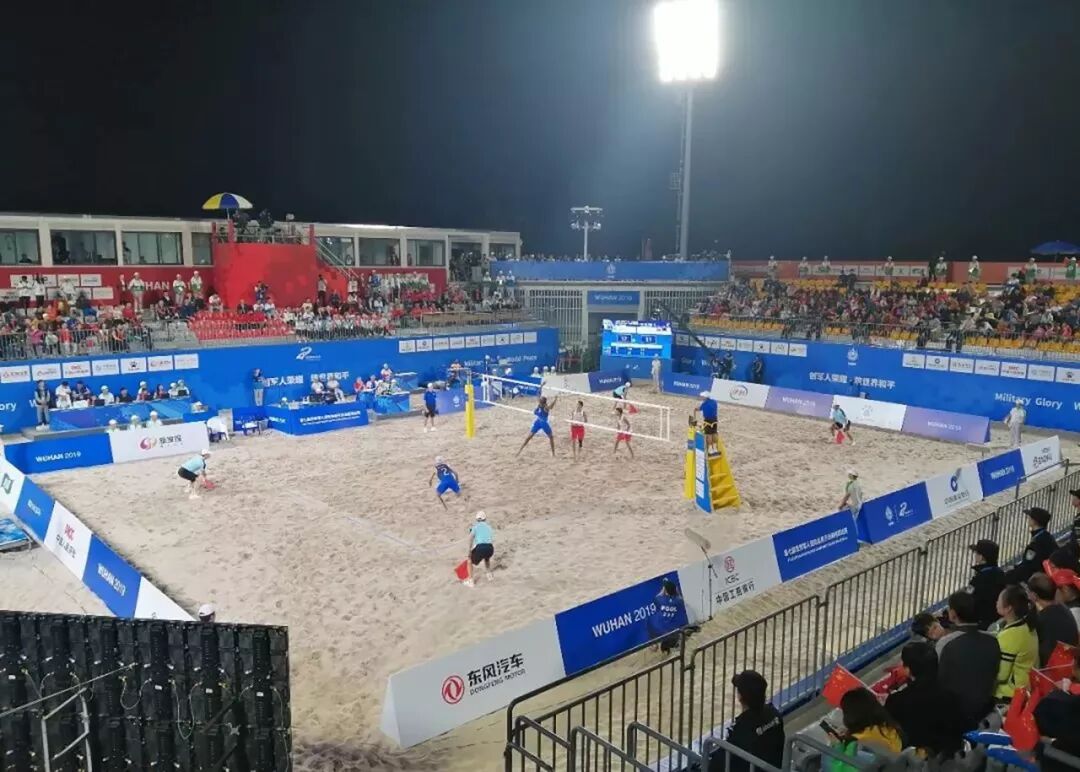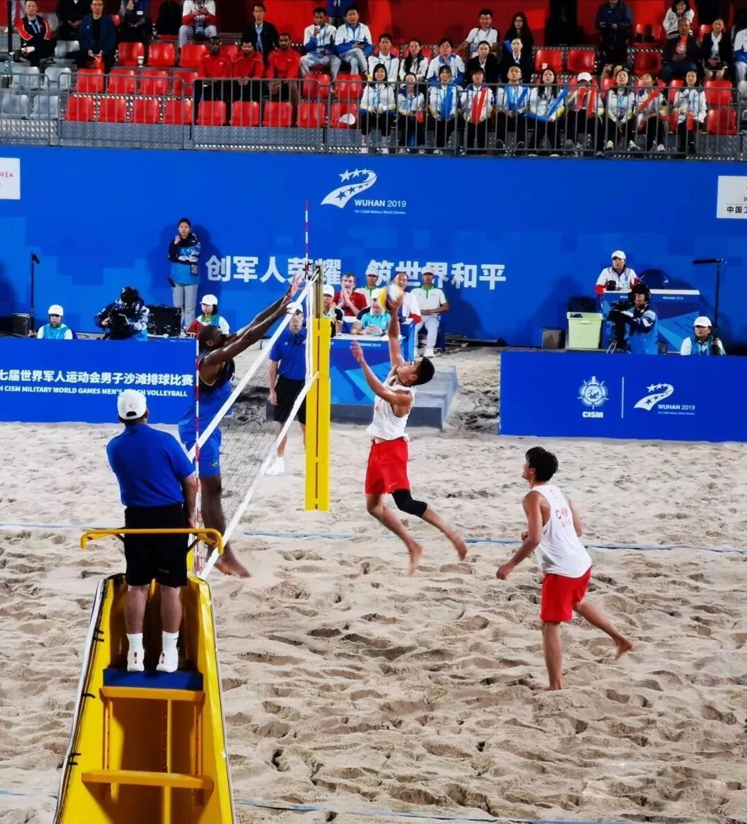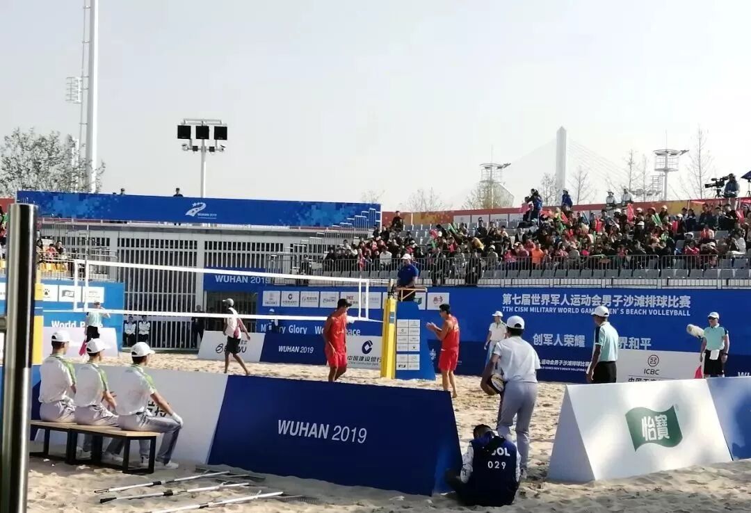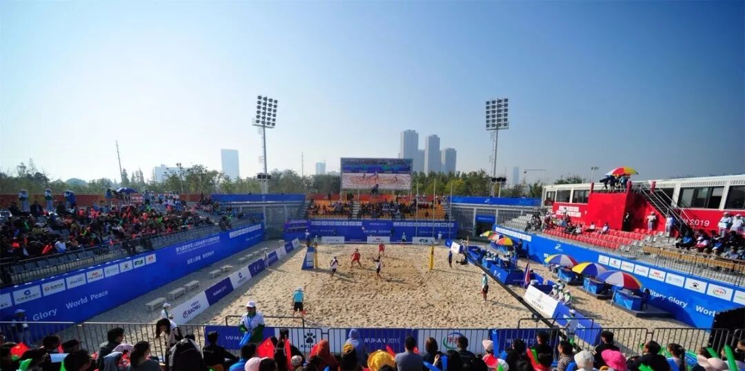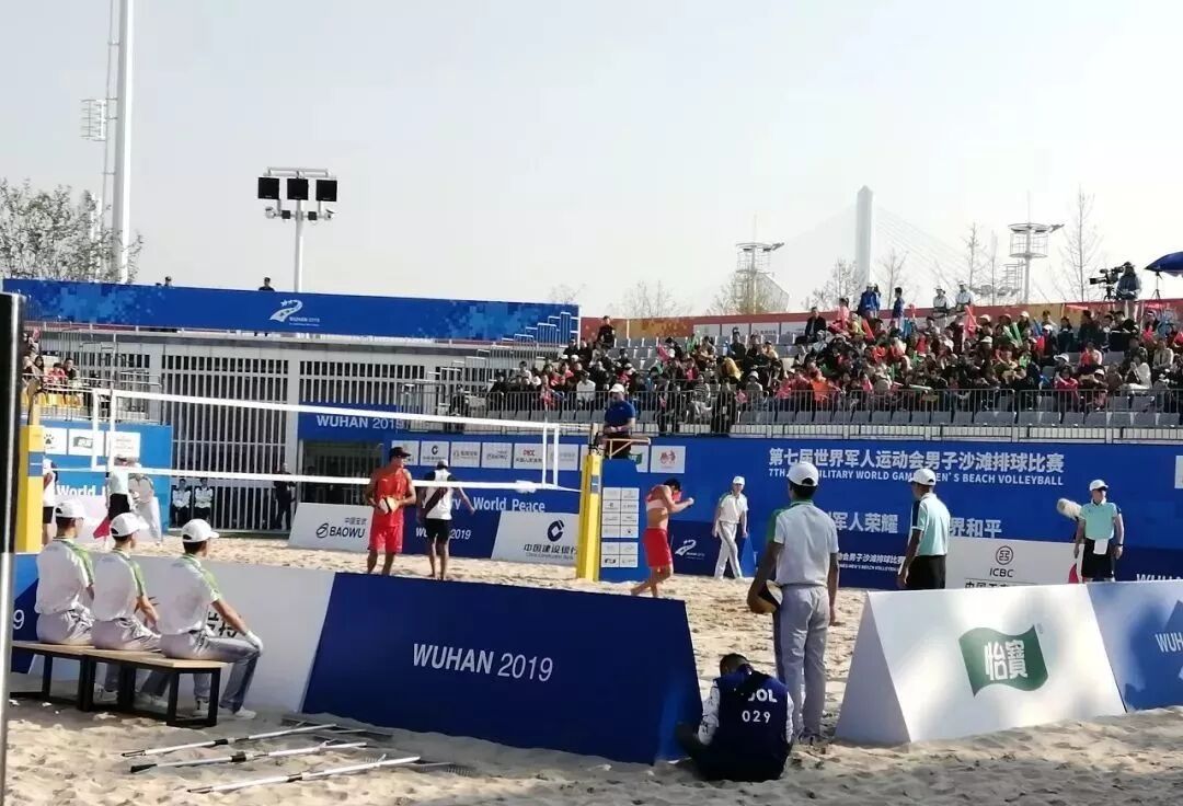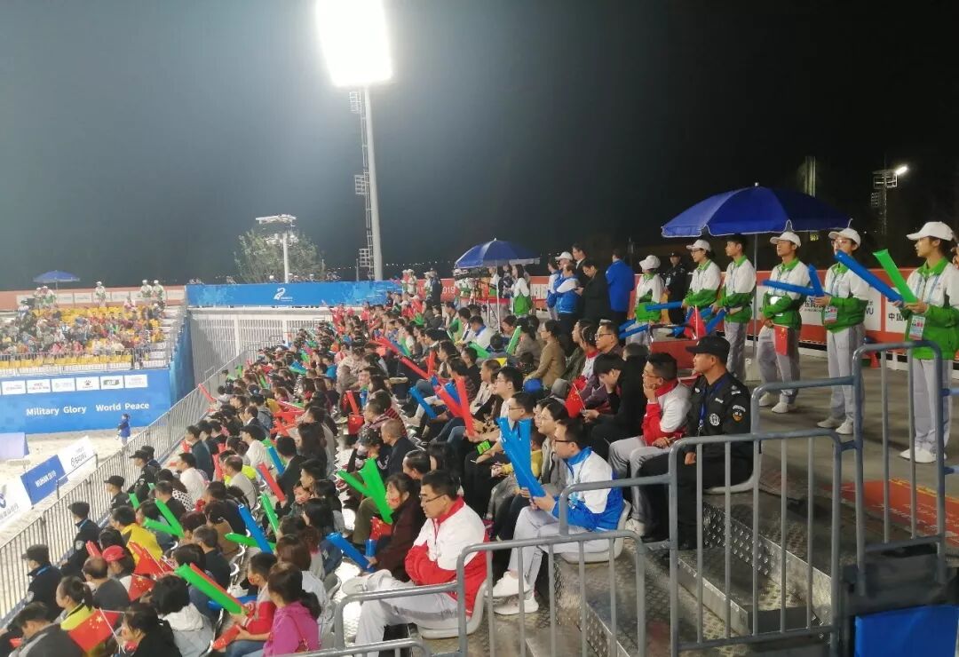 10月19日是第七届世界军人运动会男子沙滩排球项目的比赛首日,来自10个国家的50多名运动员聚集青山江滩沙滩排球中心进行比赛和训练。热情满满的观众将沙排场馆基本坐满,饱含激情地为所有参赛队伍加油!