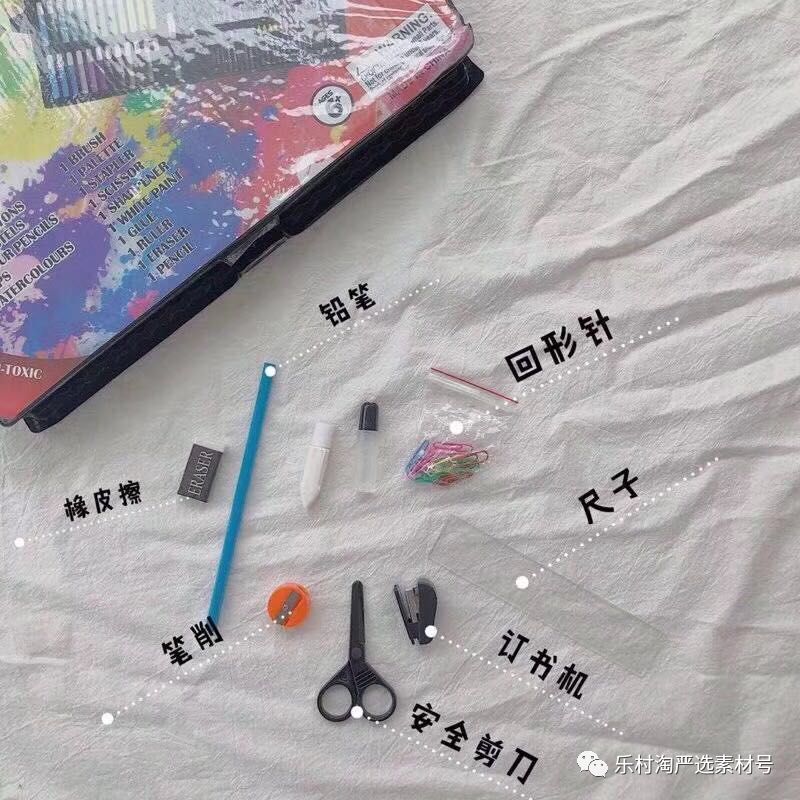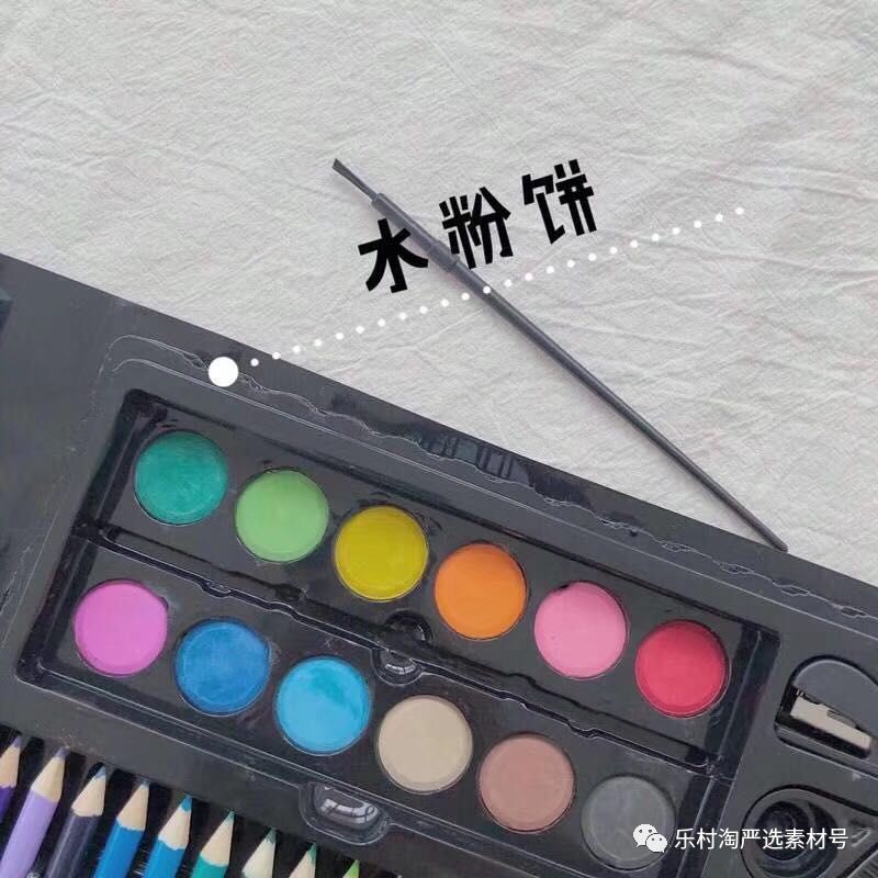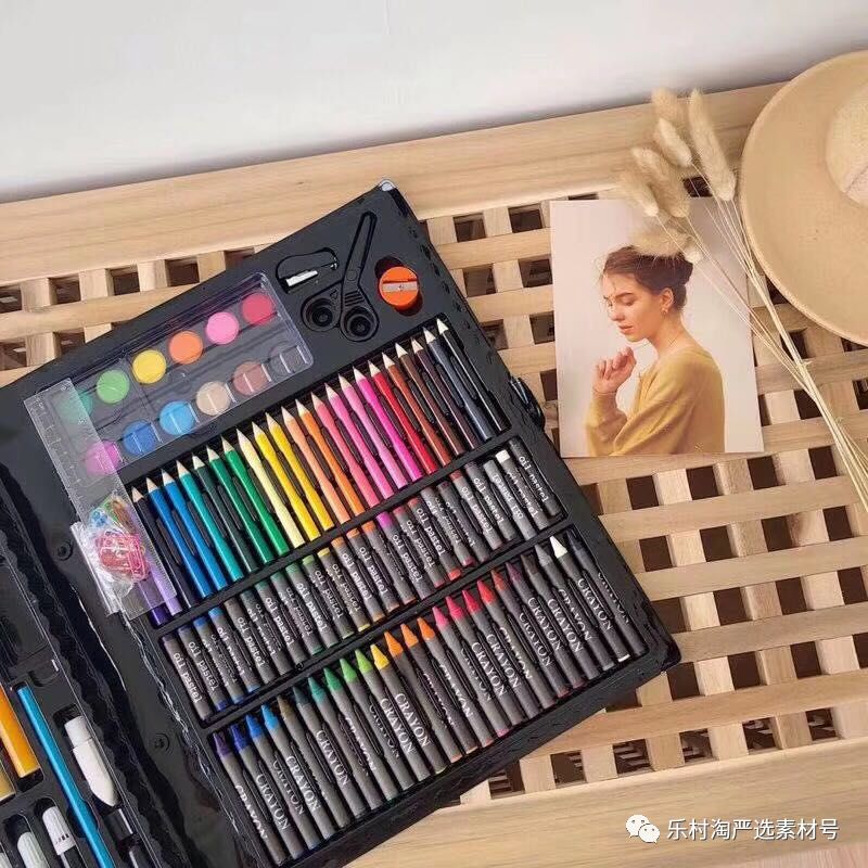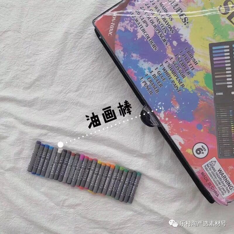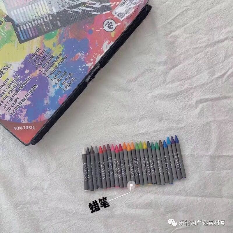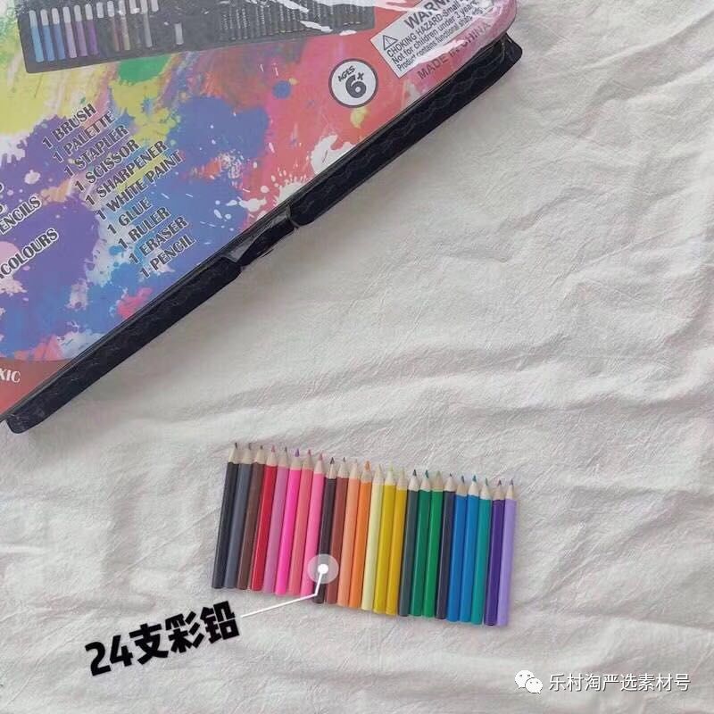 【套盒内容】36支水彩笔+24支油画笔+24支蜡笔+24支彩铅+12色粉饼+1个调色盘+20个回形针+1个卷笔刀+1支铅笔+1块橡皮+2支胶水+1把剪刀+1个订书机+1支画笔+1把透明塑料尺