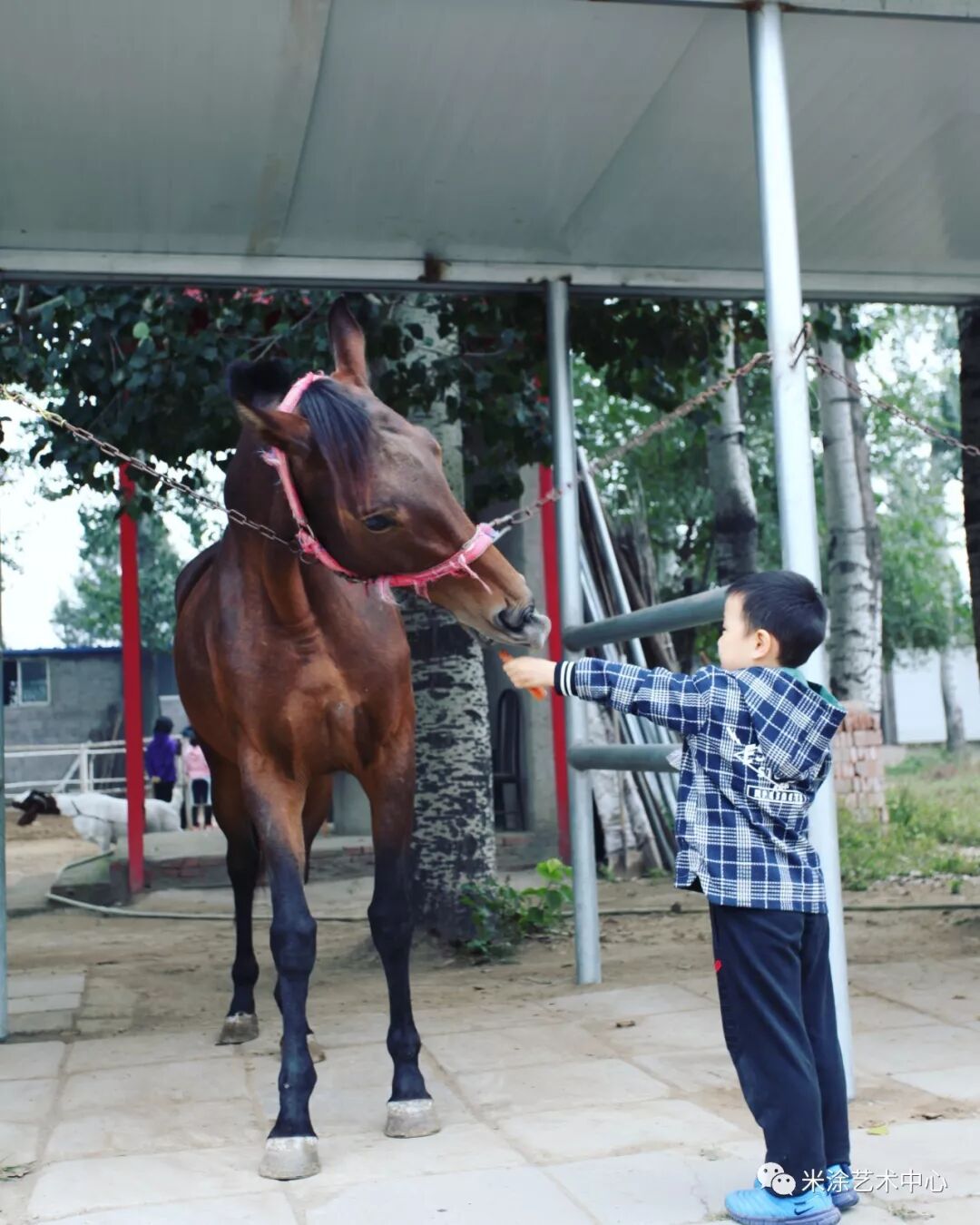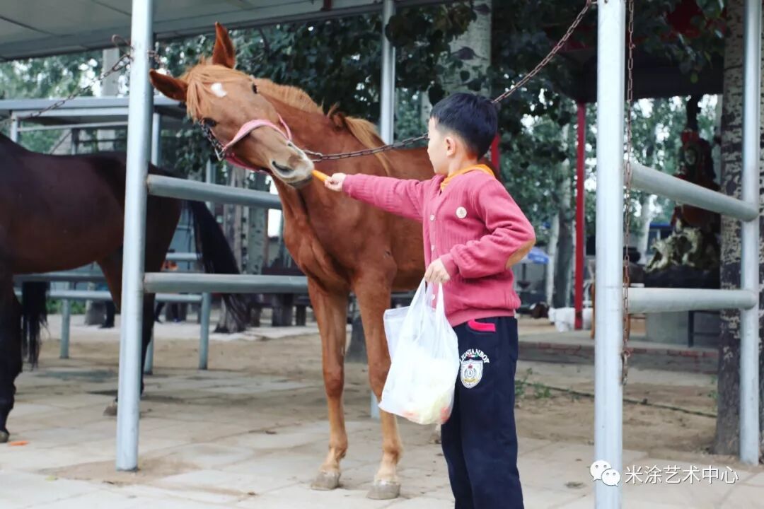 喂马 米宝们与可爱的马儿进行亲密互动,喂胡萝卜、青菜。培养米宝们的爱心,让米宝们明白与马儿、与动物和谐的相处方式,呼吁米宝们保护动物,爱护大自然。