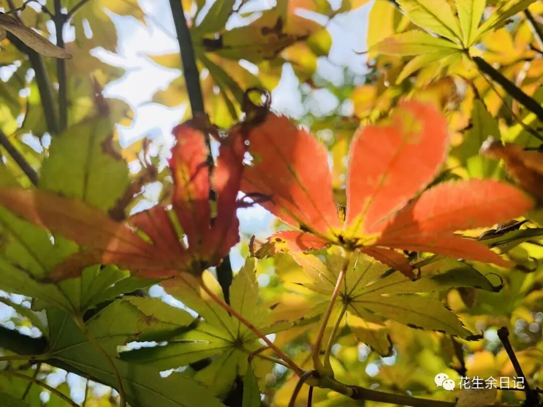 几片落叶?,散在倒映着蓝白色得天光云影的水中,让我想起莫奈的油画。不远处,鸡爪槭的红叶?、黄金菊的花瓣、连着酢浆草的黄花和醉蝶花的红须,让人很容易就被这大自然的恩赐里忘记了疲惫与压力。