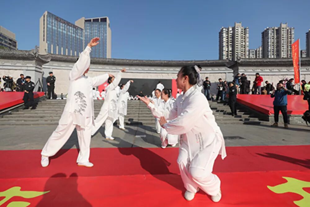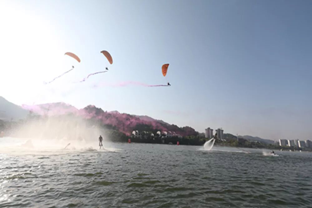 新安江上龙舟飞渡,徽州照壁体育论剑。开幕式上,水上赛艇、非洲鼓、健身气功、 徽州板凳龙、滑翔伞等精彩表演轮番亮相,新安江水面上,运动健儿们挥棹划桨、奋臂争先,一艘艘龙舟如蛟龙出海,斩浪前行,让现场观众大饱眼福。
