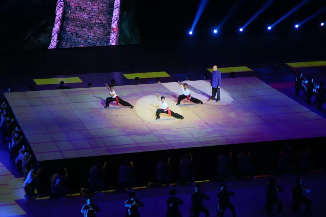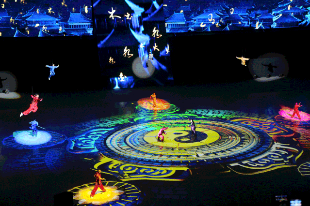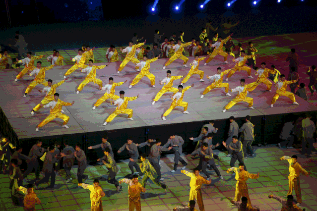 仪式部分后,开幕式进入表演篇章。《大道持中》《人天和合》《厚德载物》《世界大同》四大篇章讲述了“武术源于中国,属于世界”的故事,并以艺术化的手法表达了武术与中国传统文化的紧密联结。