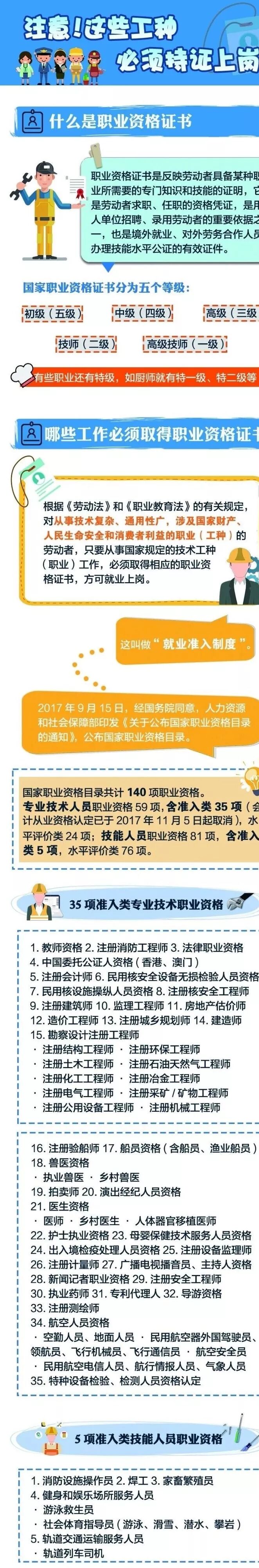 根据国家职业资格目录,准入类专业技术人员职业资格仍有35项,准入类技能人员职业资格仍有5项。这也意味着,仍有40项职业需要“先考证,再上岗”。跟小编一起看下名单!