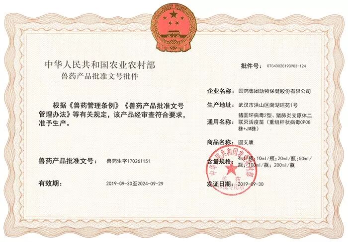 日前,在李曼养猪大会上获悉,国药集团动物保健股份有限公司(以下简称:国药动保)近日收到农业农村部核发的《新兽药注册证书》(新兽药注册证书号:(2019)新兽药证字51号)和兽药产品批准文号批件(批准文号:兽药生字170261151),这标志着国药动保的新产品猪圆环病毒2型、猪肺炎支原体二联灭活疫苗(重组杆状病毒CP08株+JM株)(商品名:圆支康) 获准上市销售。