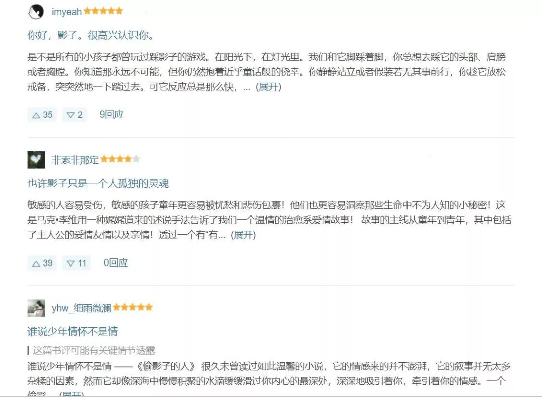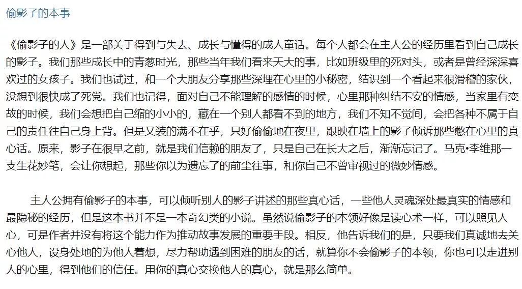 《偷影子的人》是马克?李维的第10部作品,该书在法国首印45万册,位列全年销量排行榜的总冠军,法国媒体惊叹:“销售得比影子消失的速度还快!”这部作品完美展现了马克?李维温柔风趣的写作风格,有催人泪下的亲情、浪漫感人的爱情和不离不弃的友情,清新浪漫的气息和温柔感人的故事相互交织,带给读者笑中带泪的阅读感受,是一部唤醒童年回忆和内心梦想的温情疗愈小说。