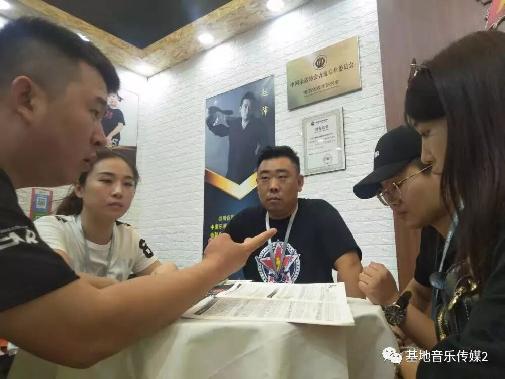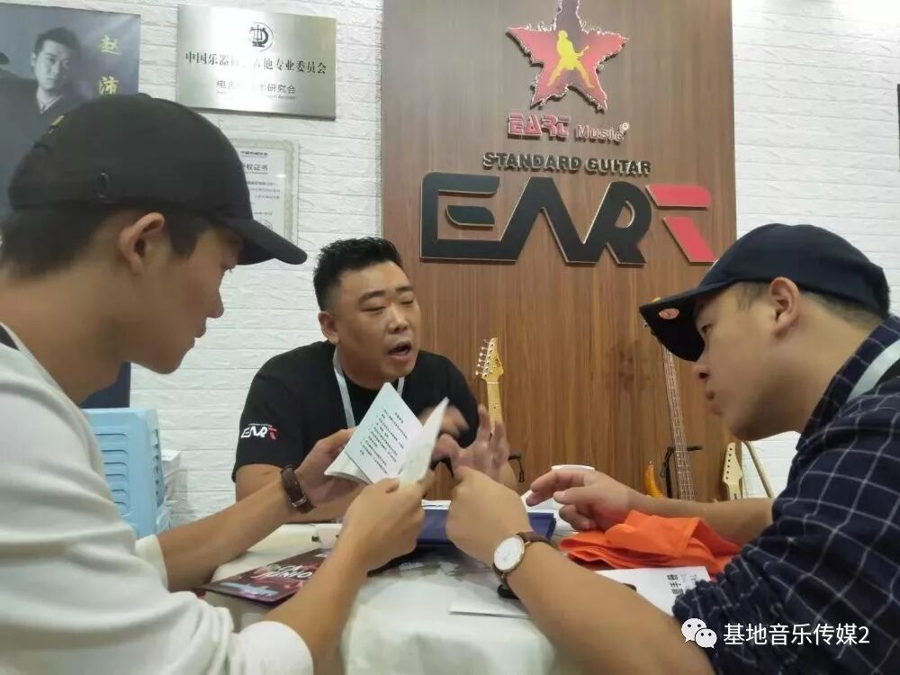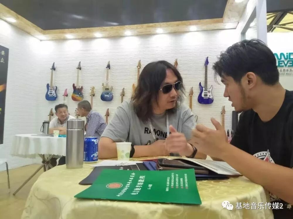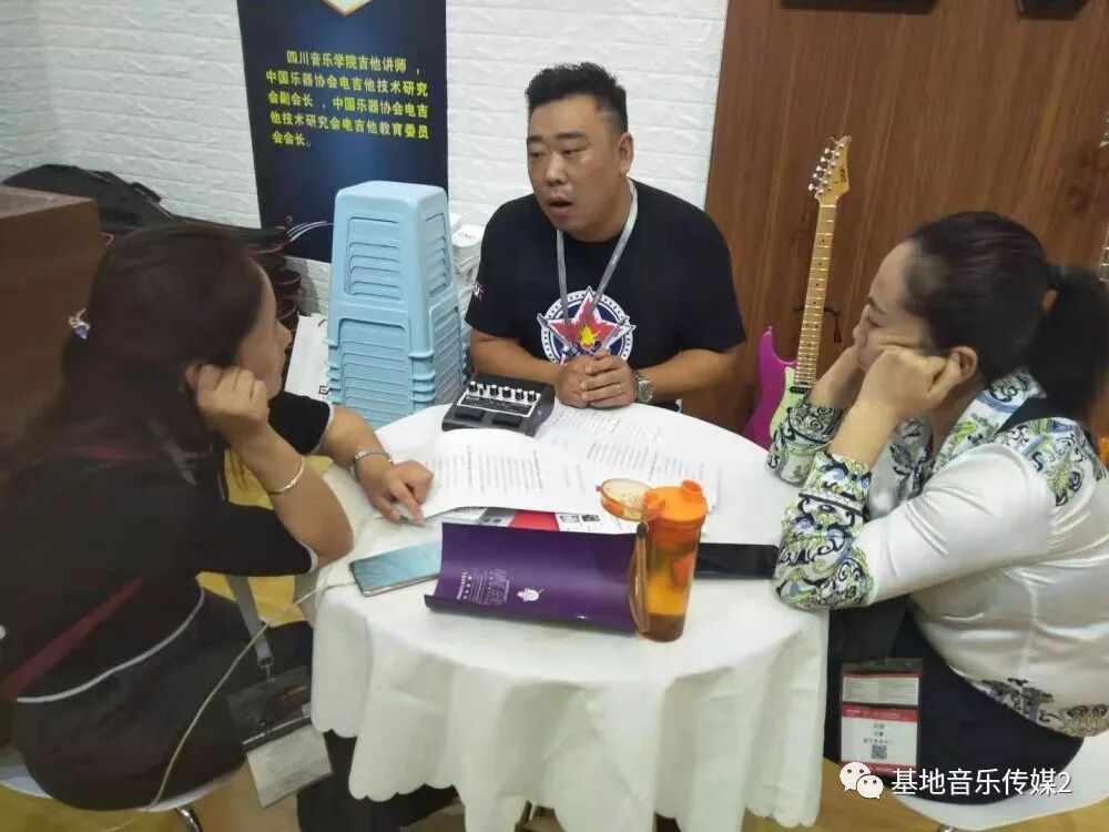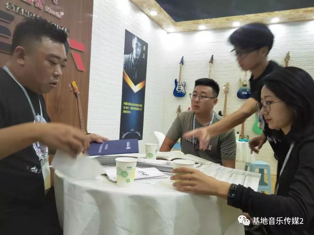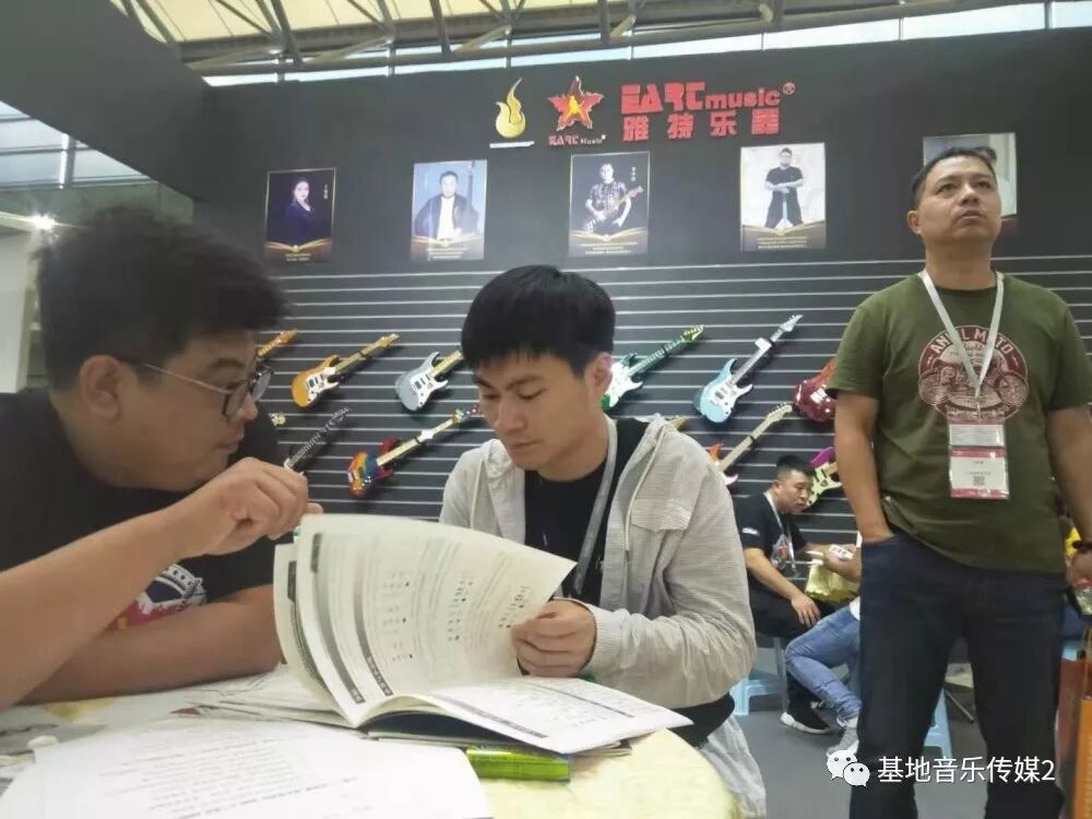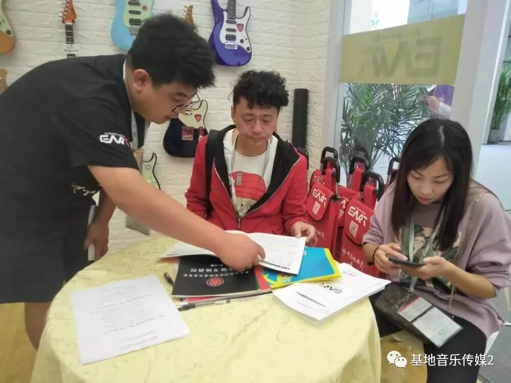 吴 琳(中)在展会上讲解他编著的吉他教材