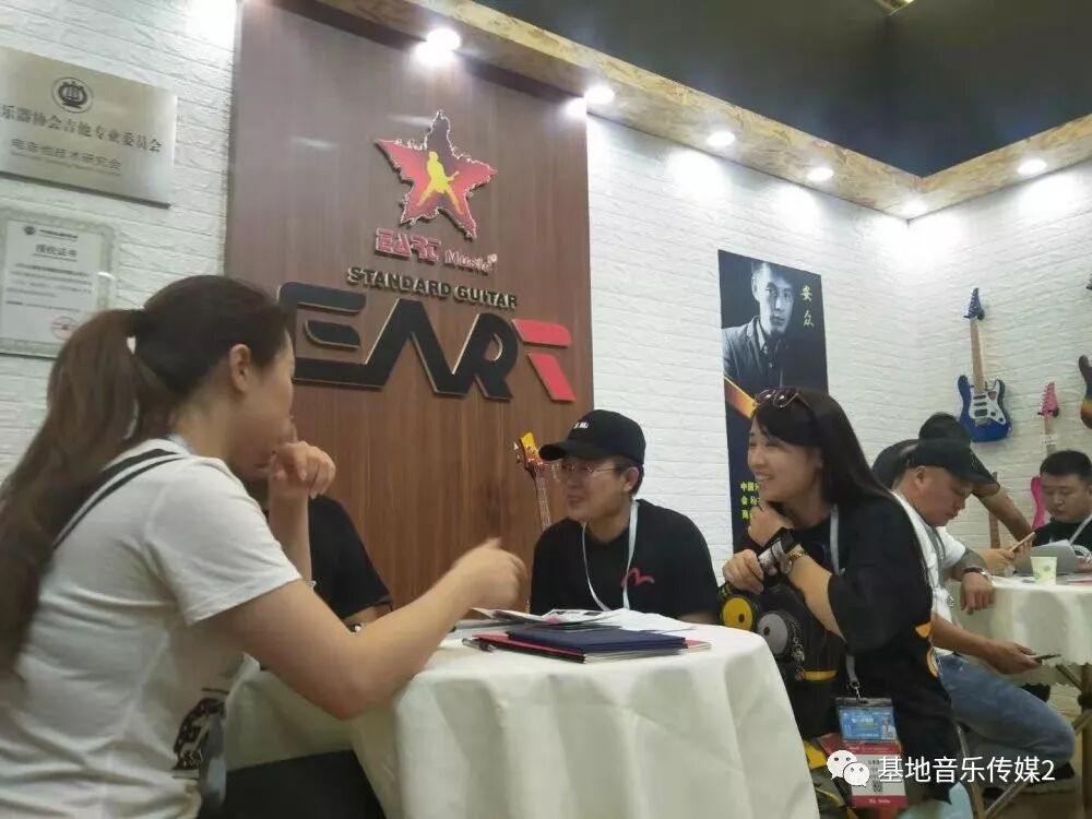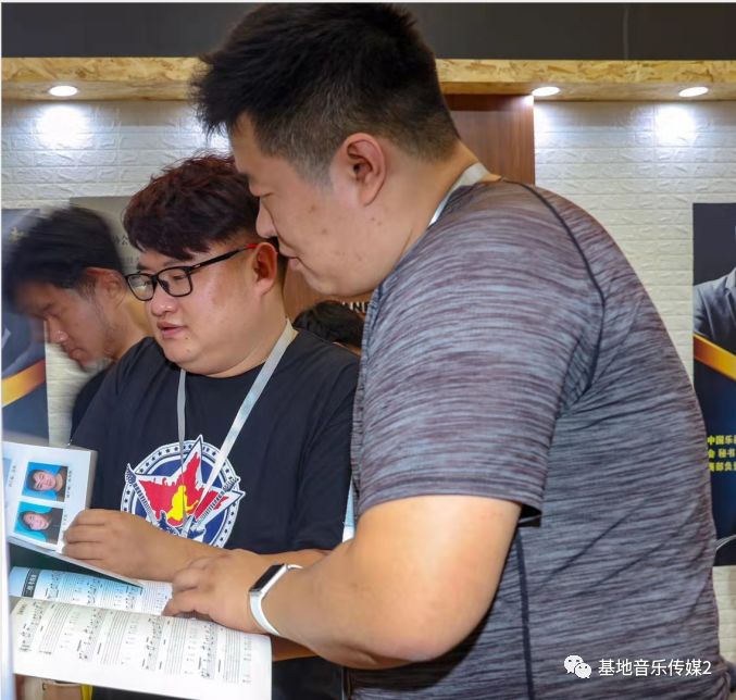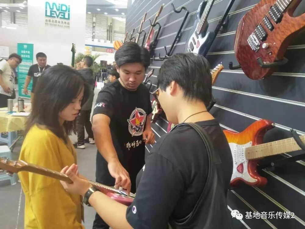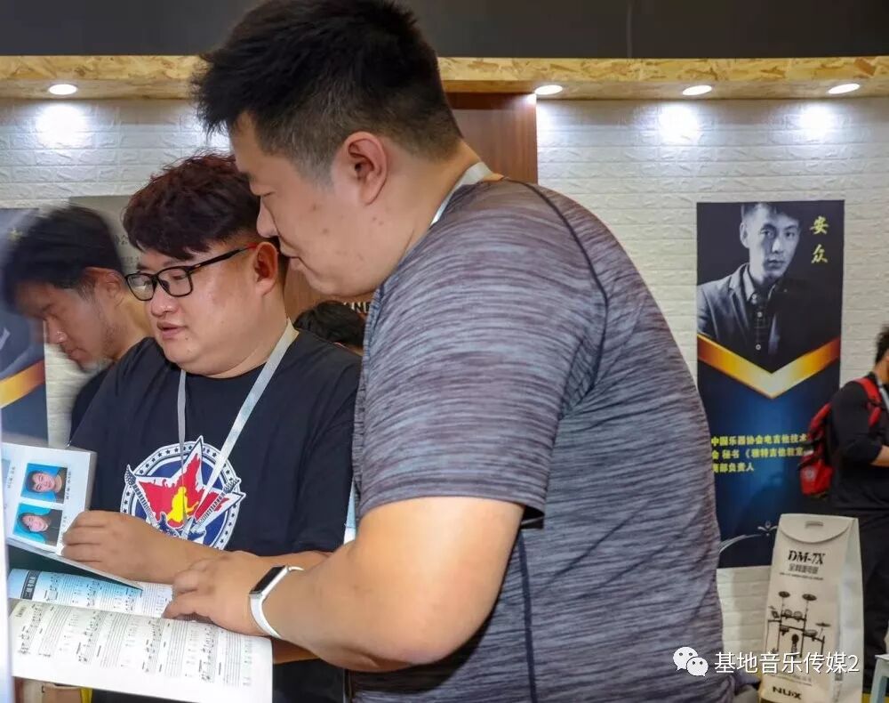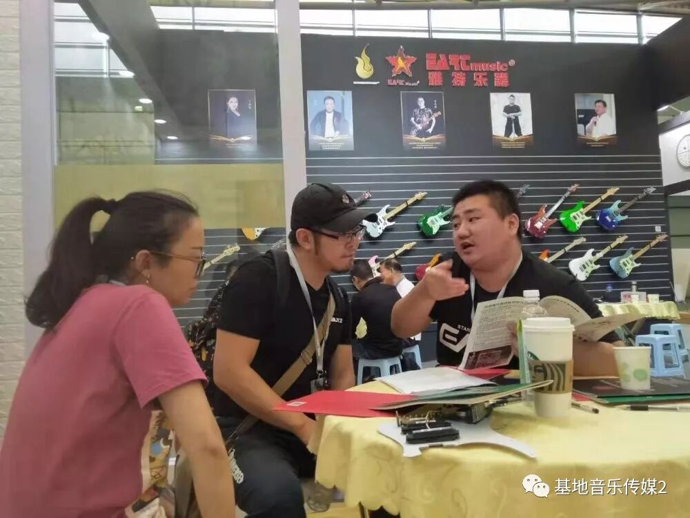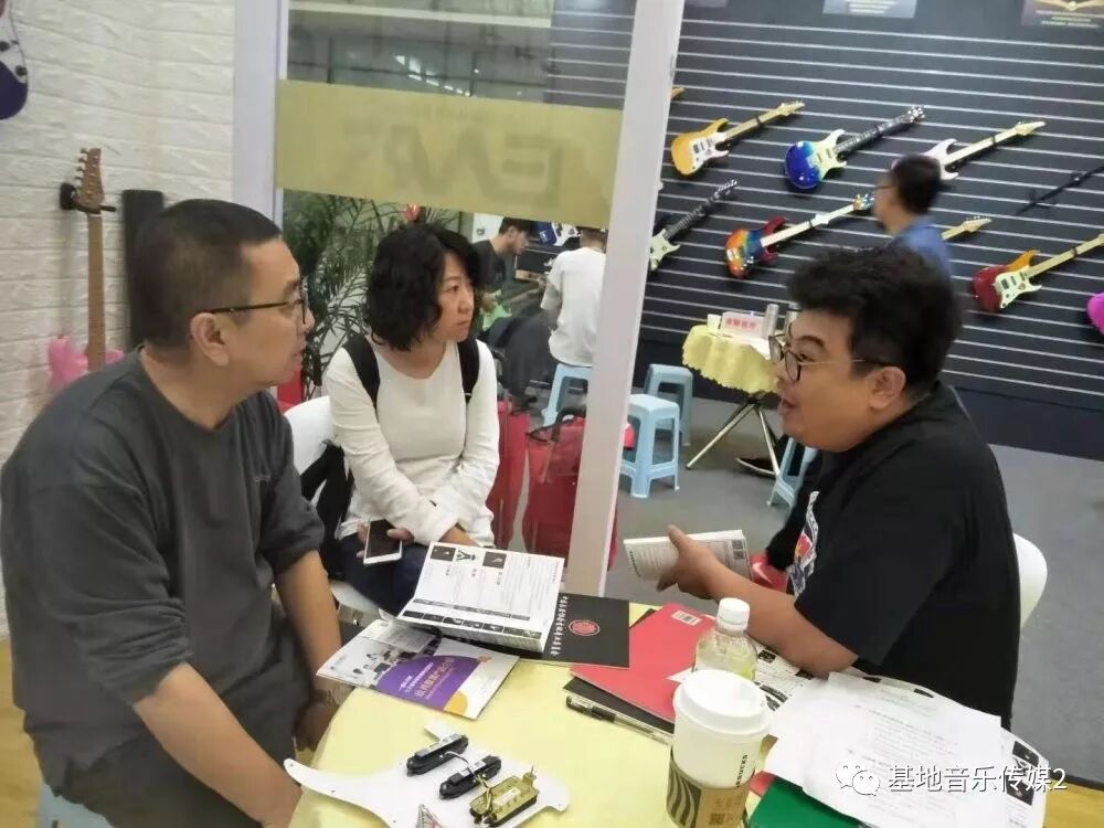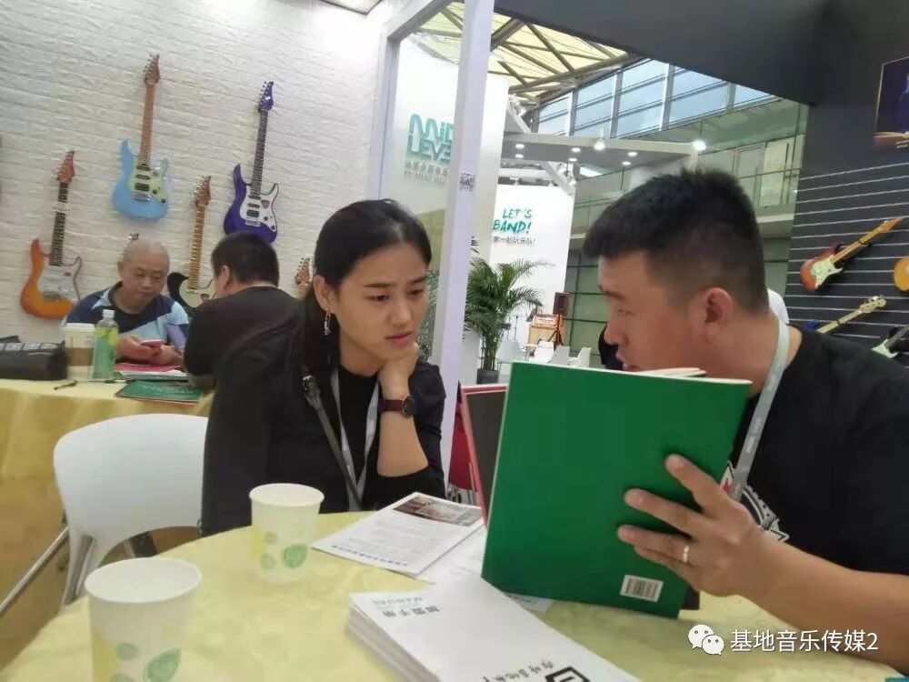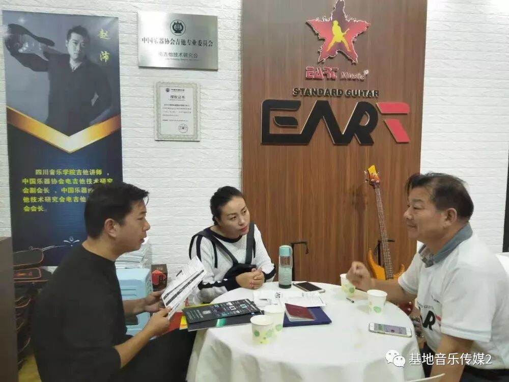 吴 琳(中)在展会上讲解他编著的吉他教材