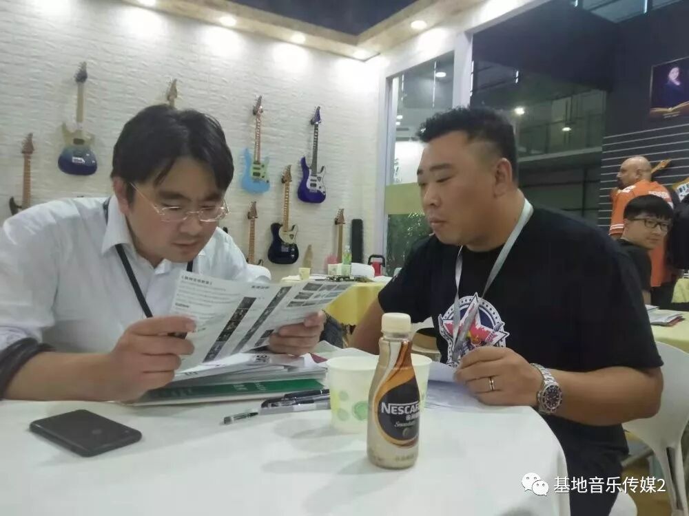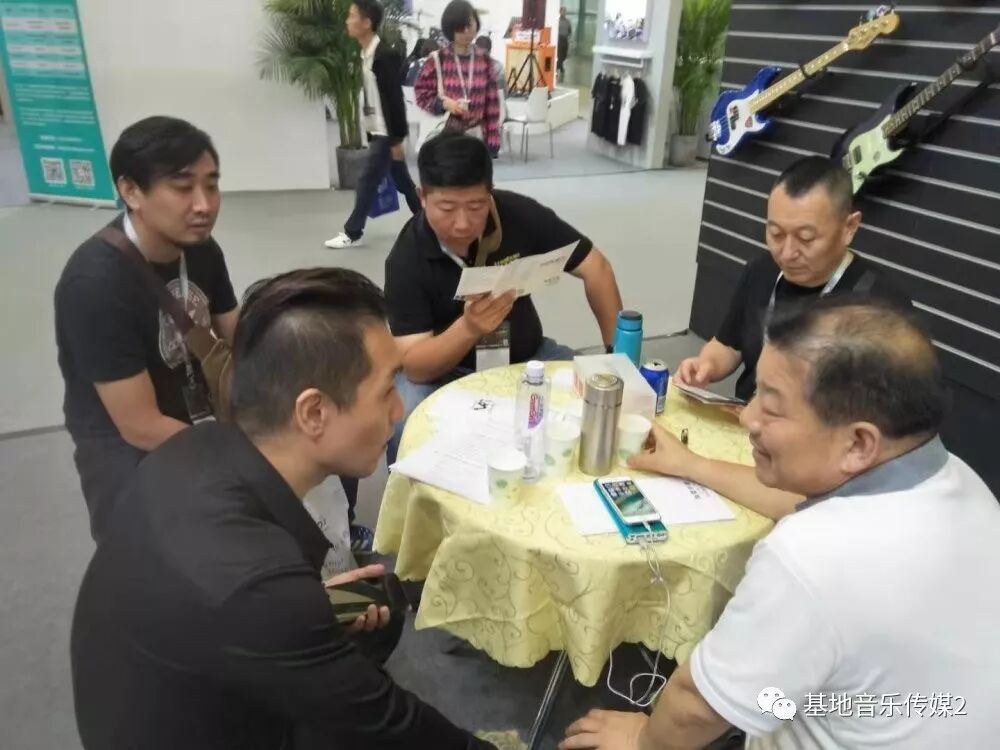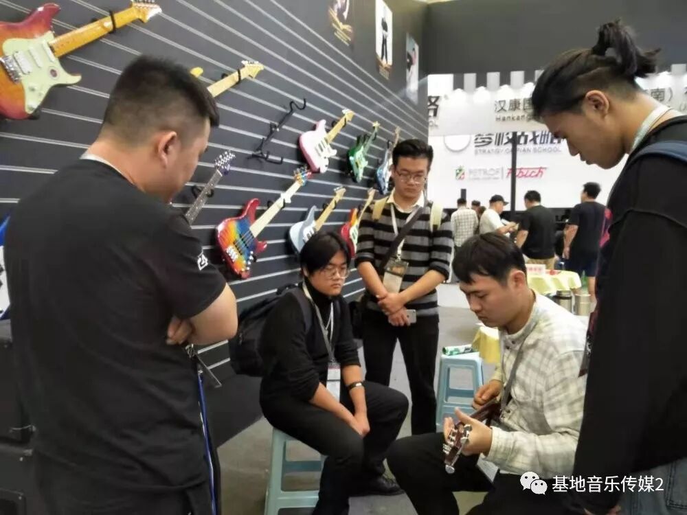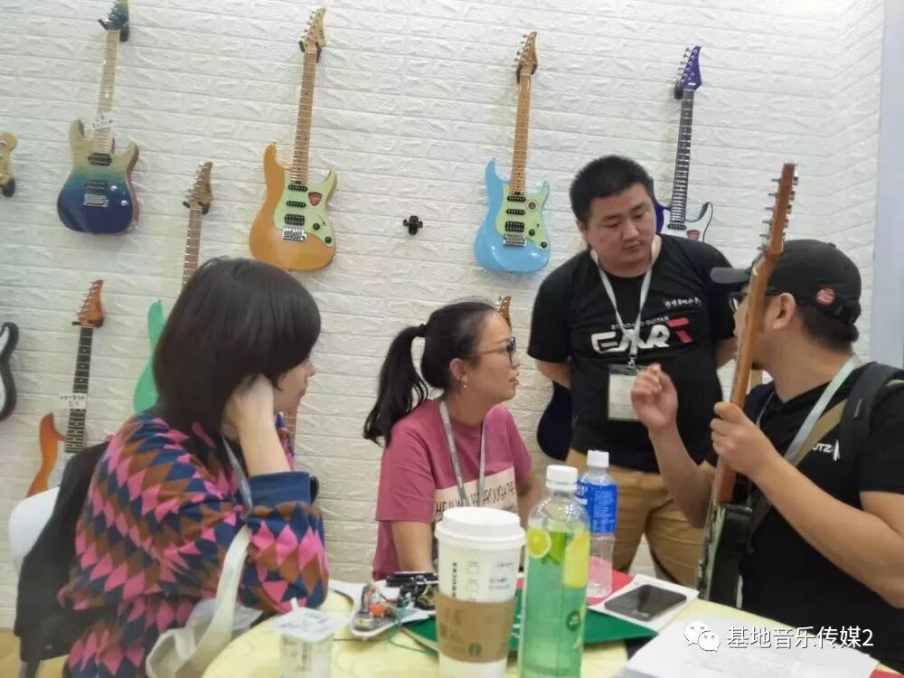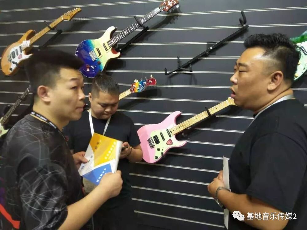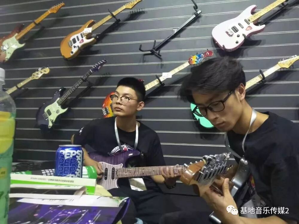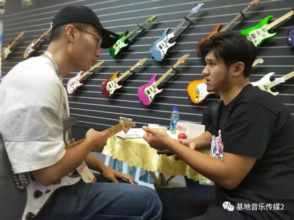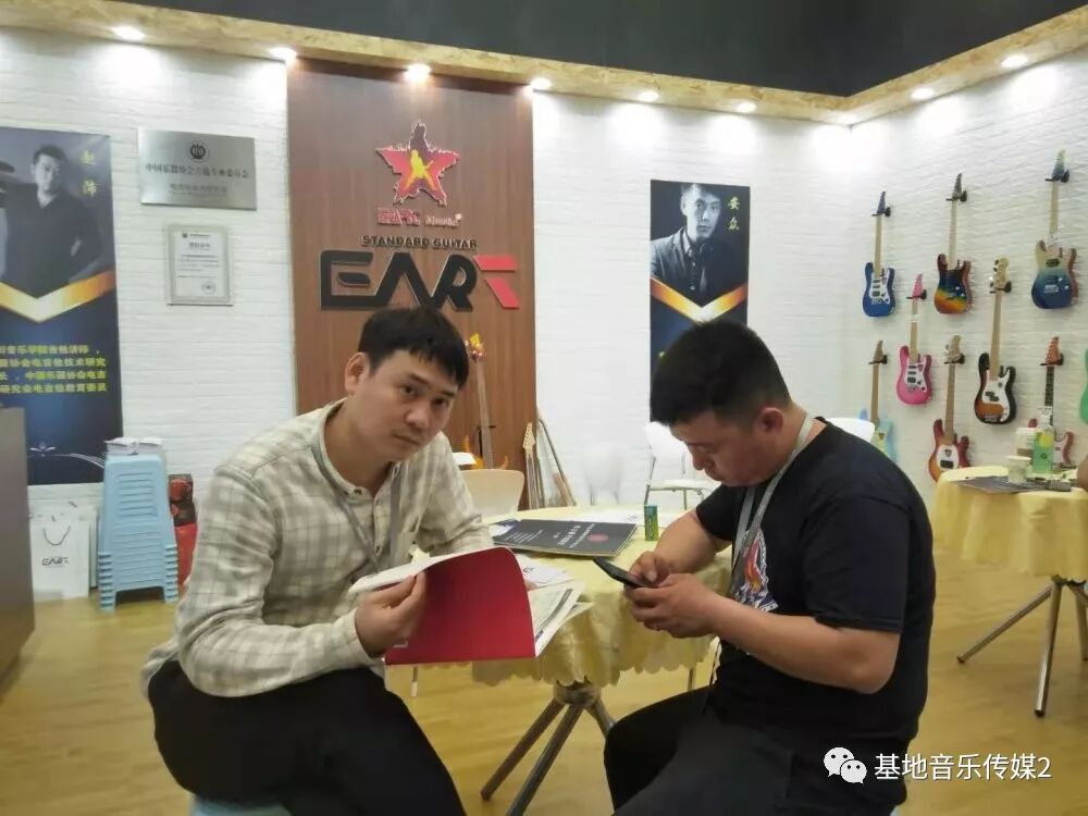 吴 琳(中)在展会上讲解他编著的吉他教材