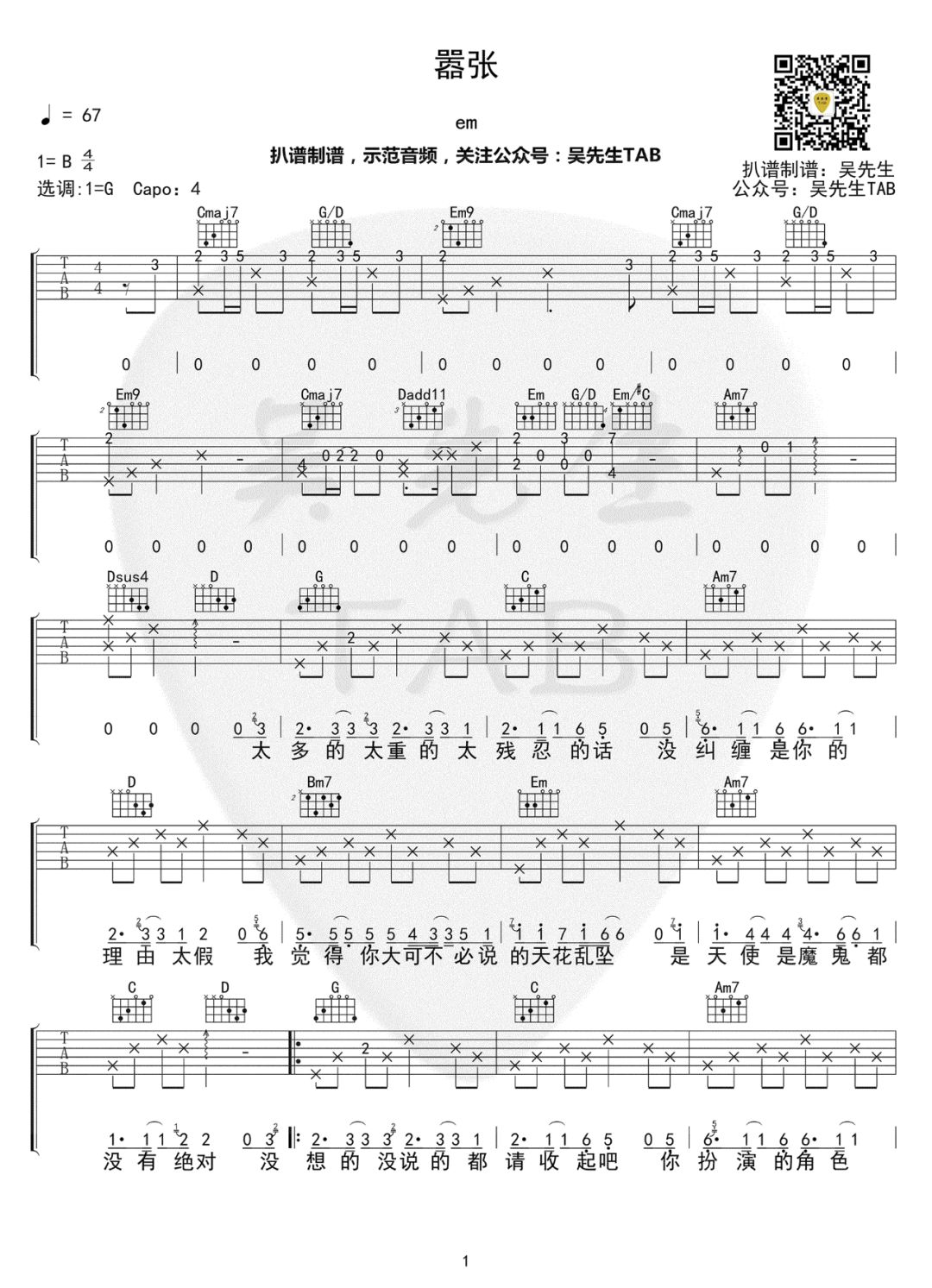 《嚣张》吉他谱,感谢@吴先生TAB出品。编配制谱不易,欢迎琴友们关注支持吴老师公众号,一起学习吉他吧。