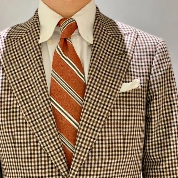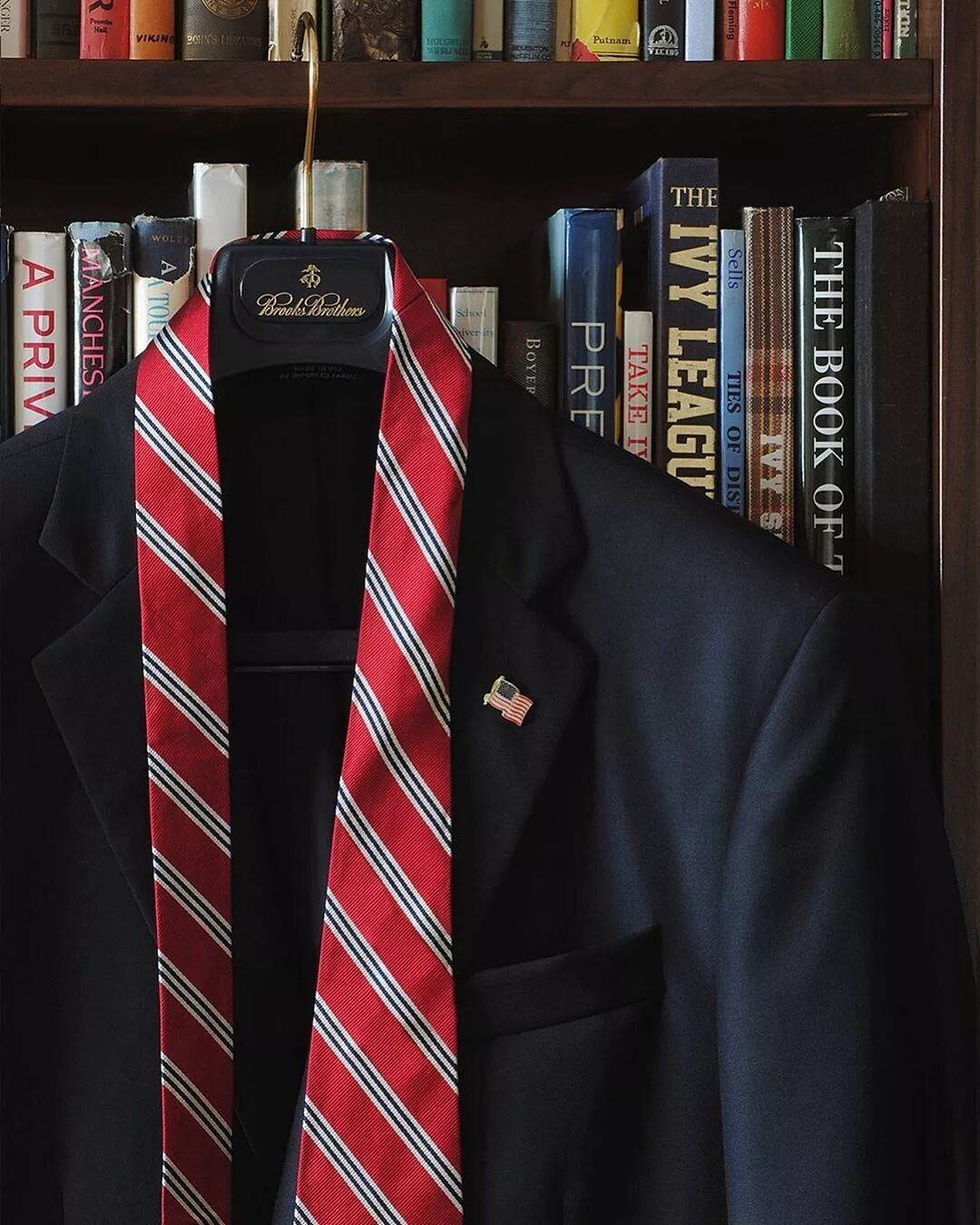其实最初条纹领带的走向是右斜上方的,是当时英国军人佩戴来证明所属的军队。就着这一点,Brooks Brothers 的董事长便想到了将这种条纹的走向反过来设计,打造出具有代表性的美式领带。