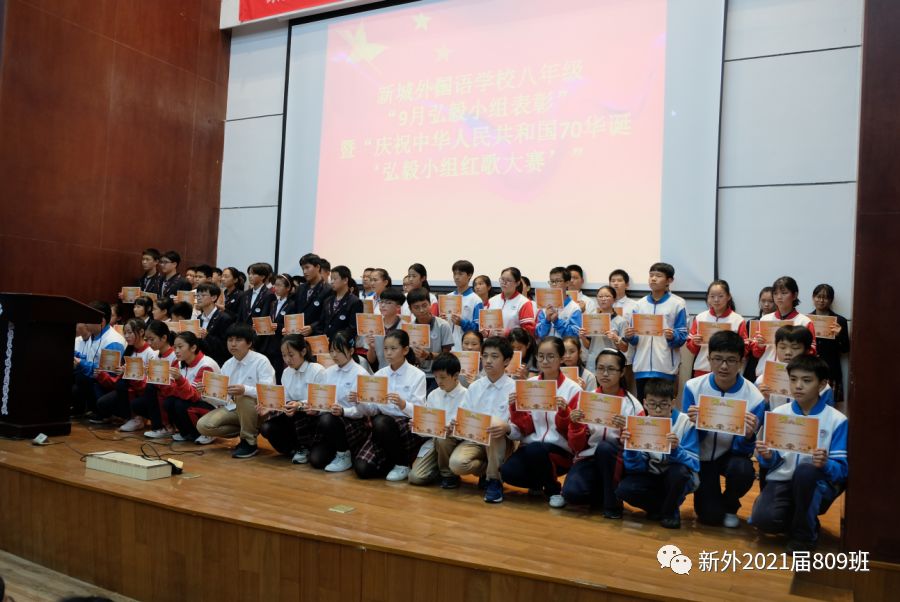 金秋送爽,丹桂飘香。10月13日下午新城外国语学校八年级组全体师生齐聚报告厅,参加“九月弘毅小组表彰大会暨弘毅小组红歌大赛”。本次大会由年级组长朱静雅老师主持。