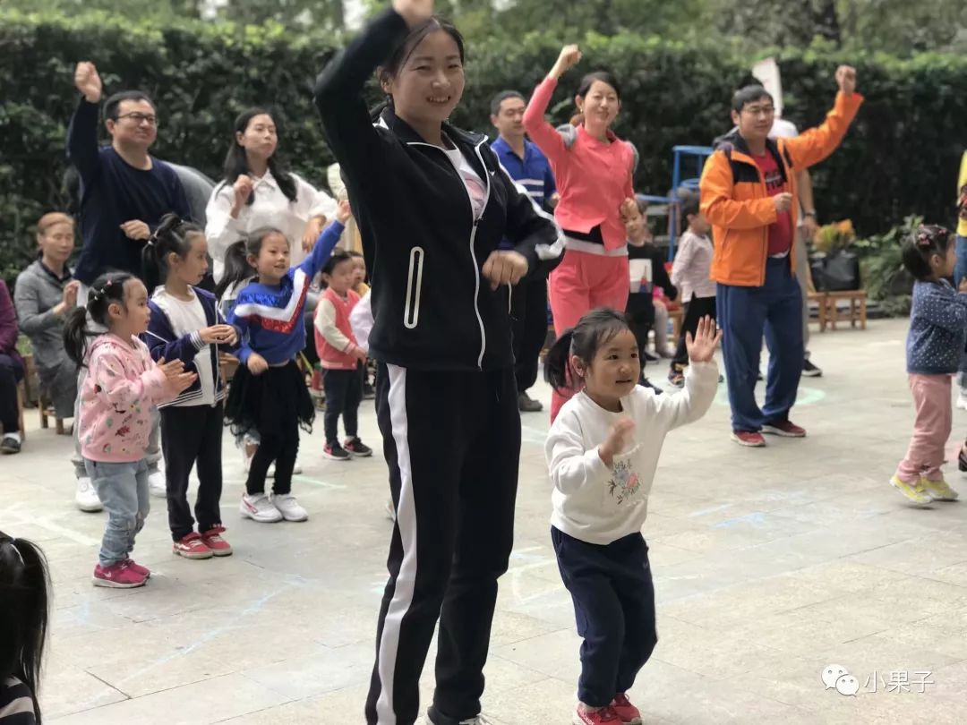 然后,在小露老师的带领下,和着欢快的音乐,家长和孩子们一起跳起了热身操。