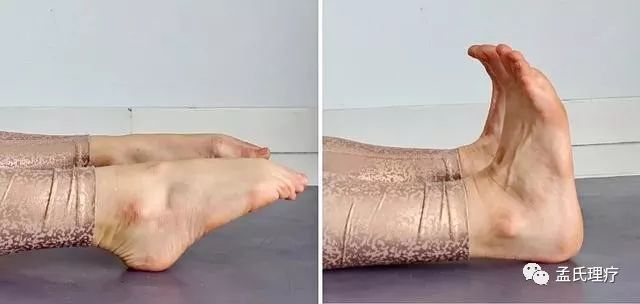 坐在垫子上,双腿伸直,双脚并拢,脚趾朝天空。做脚背绷直和脚背回勾的运动。做20~30次。注意点:不管是脚掌回勾还是绷直,都做到最大限度;脚背绷直的时候,脚趾努力向下去找地板;脚掌回勾的时候是整个脚掌向回勾;脚后跟贴着地板往远处蹬,脚后跟不要离开地板,离开地板就有可能是膝盖超伸了。
