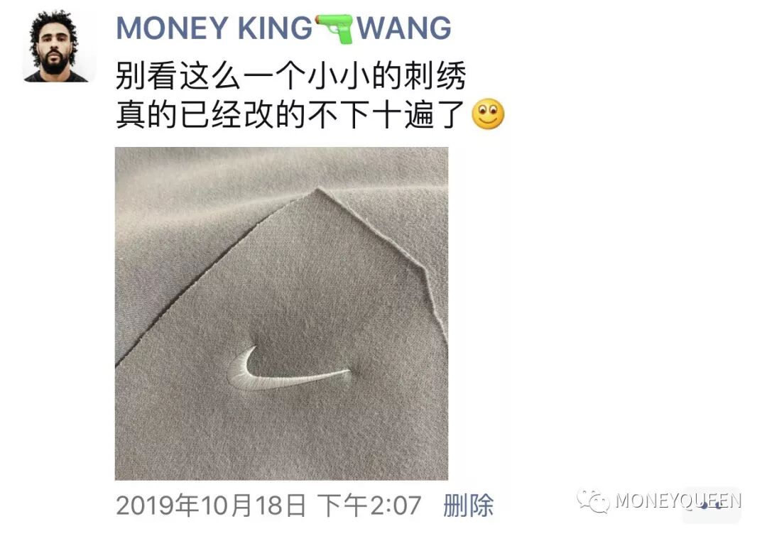 9月份开始就在各大工厂寻找最好的刺绣工艺,正因为整件衣服就一个nike LOGO,所以更要把刺绣做到极致