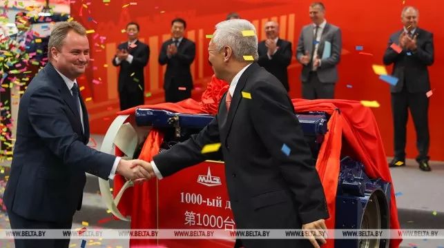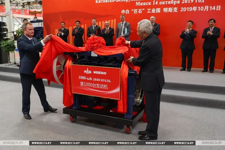 白罗斯工业部长巴维尔·巫丘平和山东省副省长凌文为“玛兹—潍柴”生产的第1000台发动机揭彩