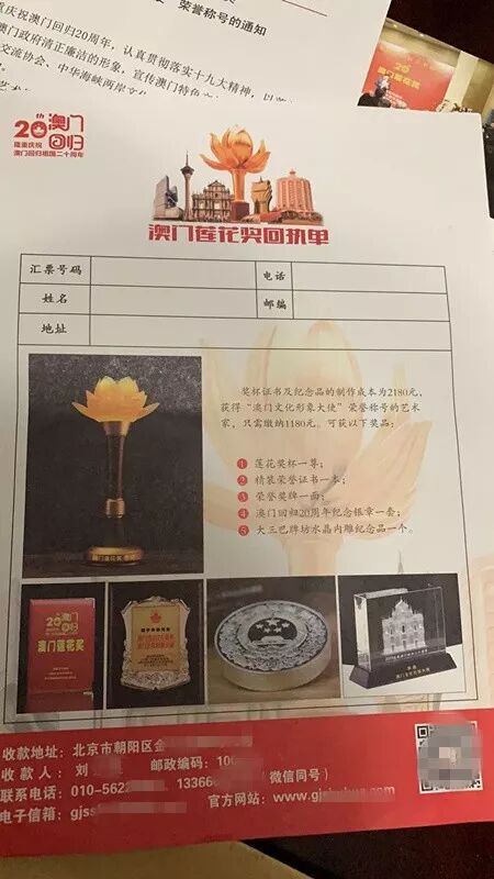 日前,有个叫中国文化交流协会的颁奖信寄到了家里,信里的回执单上印着:“只需缴纳1180元”,可获一个奖杯、一个证书、一个奖牌、一套银章和一个内雕纪念品。