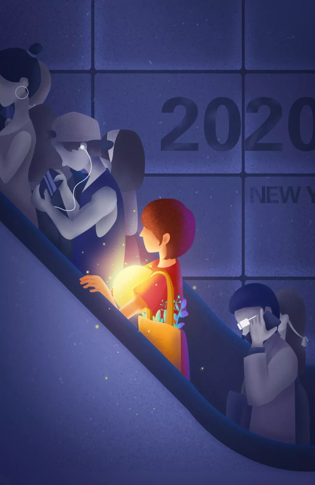 我平时喜欢看科幻片,尤其是平行时空的主题比如《彗星来的那一夜》《你的名字》《穿越时空的少女》等,有时候会幻想另外一个时空的自己此时此刻在忙什么…….于是,在我思考12月画什么的时候,我脑海里面浮现了这样的一个画面:一个即将挥手告别的自己(2020年)和准备进入未来的自己(2021年)在时空里交接金钥匙(代表着成长)。