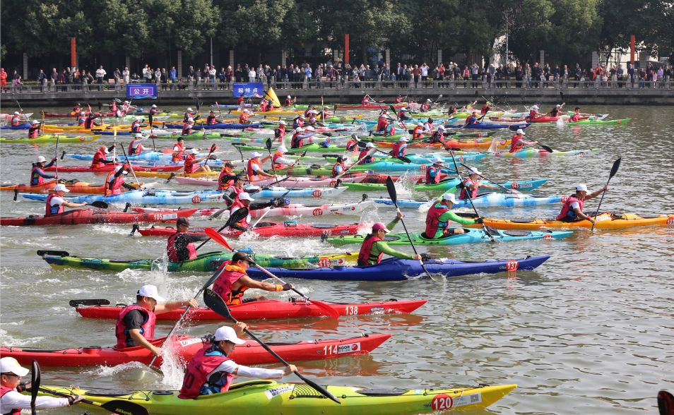 今日的环城河畔人头攒动,上演速度激情的水上运动。300多名运动员,260艘船艇在水面上书写着绍兴新时代的东方“船”奇。 随着裁判的一声令下,公开组,男双,男单,女双,女单5大组别分批有序出发。