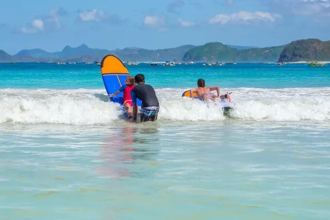 【如何玩】即使从没接触过也不要紧,初学者,教练会安排在浅滩练习,不会有急浪,下水后也会有教练在身后保驾护航,当练习了1-2小时以后,就能在浪里站起来。