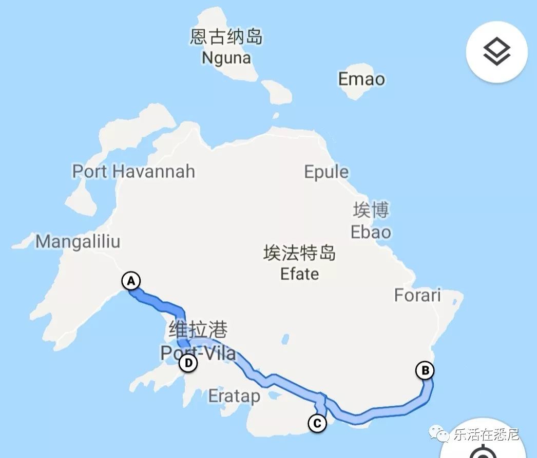 通过TripAdvisor网站预订了一个套餐,从酒店出发,车接车送,一共包括三个景点:Evergreen Cascades Waterfall,Blue Lagoon和Swim with Turtles at Naiwe Beach,还有BBQ午餐,三个人一共是250澳元(19000VT)。整个行程大约100公里,耗时约六个小时。路线如下图: