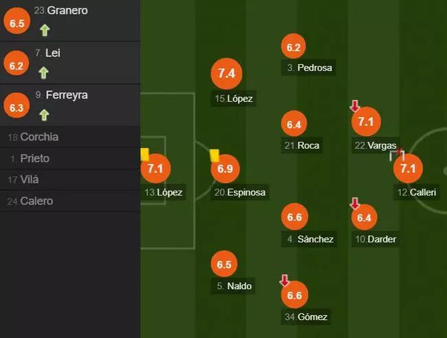 上半场比赛进行到第37分钟的时候,西班牙人获得了全场最好的一次机会。西班牙人利用战术角球制造威胁。禁区内卡莱里的头球已经让对方门将毫无办法,但是却被门柱拒绝。半场结束的时候,西班牙人也不得不暂时0:1落后比利亚雷亚尔。