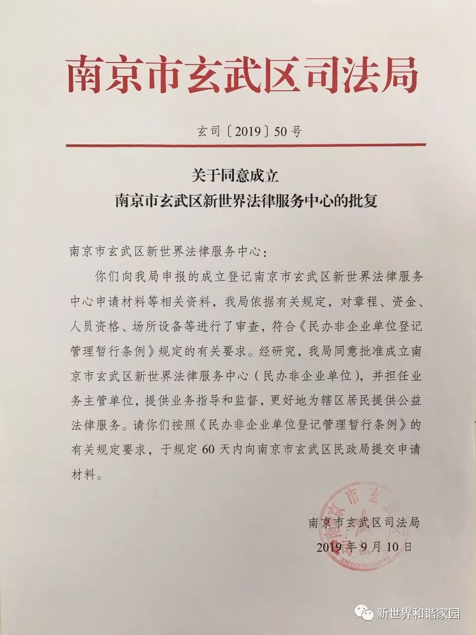 9月30日,南京市玄武区民政局为南京市玄武区新世界法律服务中心颁发登记证书。新世界法律服务中心的启用,标志着在新世界中心法律服务实体平台实现全覆盖。