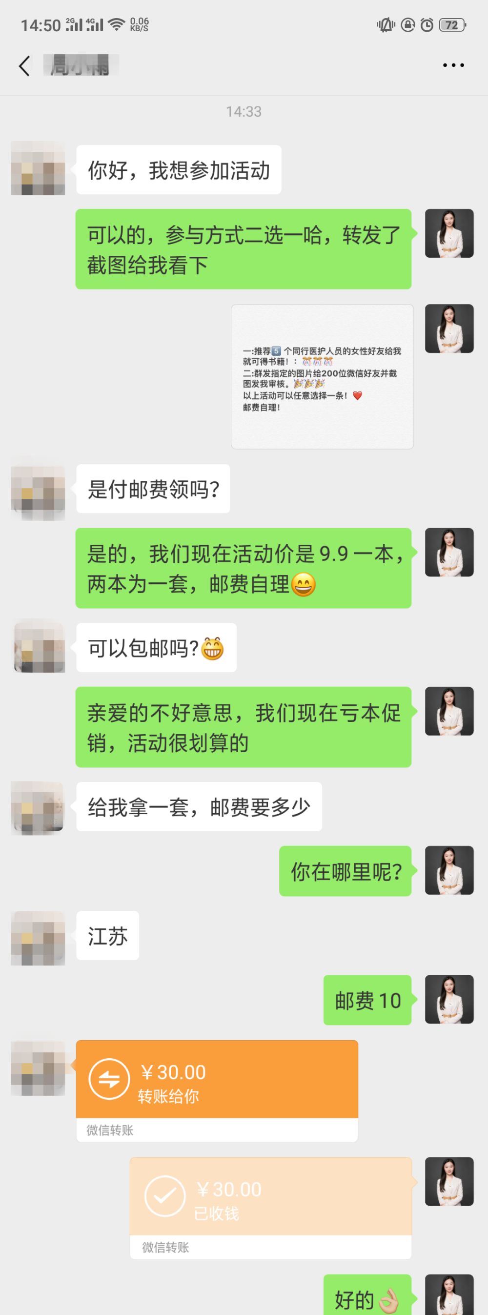 1、推荐5个医护同行人员的女性好友给我们,即可9块9获得一本书籍。2、群发指定的图片给200位微信好友并截图,也可9块9获得一本书籍。书籍包含:1、《三级健康管理师习题集上册》2、《三级健康管理师习题集下册》3、《健康管理国家职业资格三级章节练习上册》4、《健康管理国家职业资格三级章节练习下册》5、《健康管理国家职业资格三级》6、《健康管理国家基础知识》