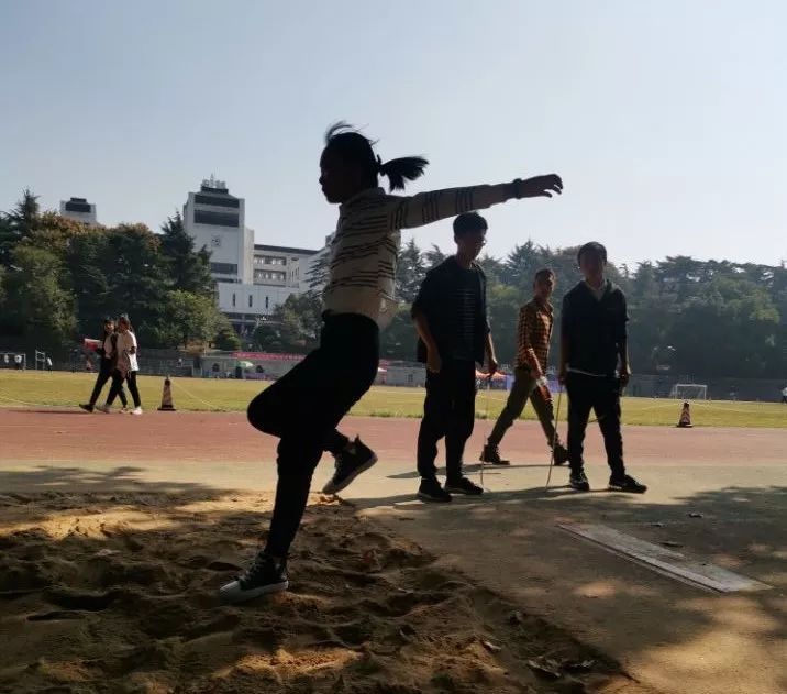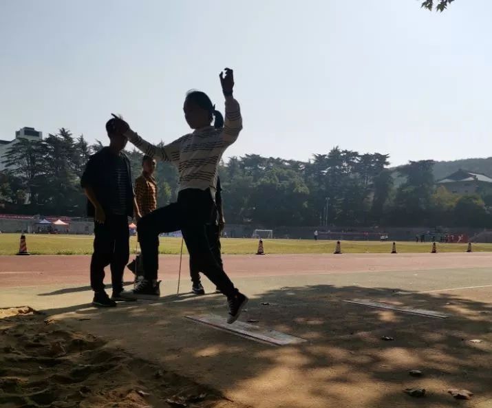 在径赛热火朝天进行的同时,在跑道一边的跳远比赛也十分紧张焦灼。大家听到“跳远”,第一印象可能是站在白线前,酝酿几下后轻松从原地跳出。然而,too young too naive!跳远并非立定跳远,而是急行跳远……
