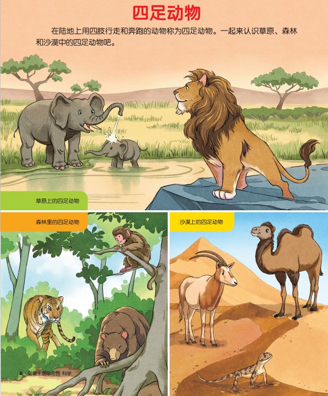 如,让孩子观察以下图片,问他,你看到了哪些动物?它们分别是什么样的?动物有几条腿?生活在哪里?它们有什么共同点?你在生活中还见过哪些四足动物,它们分别是什么样的?