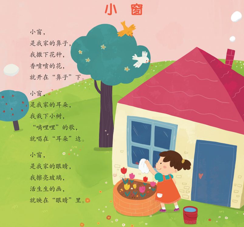 如,读以下的小诗问孩子,为什么说小窗是“鼻子”?它能闻到什么?为什么说小窗是“耳朵”?它能听到什么?为什么说小窗是“眼睛”?它能看到什么?小窗还可以是什么呢?