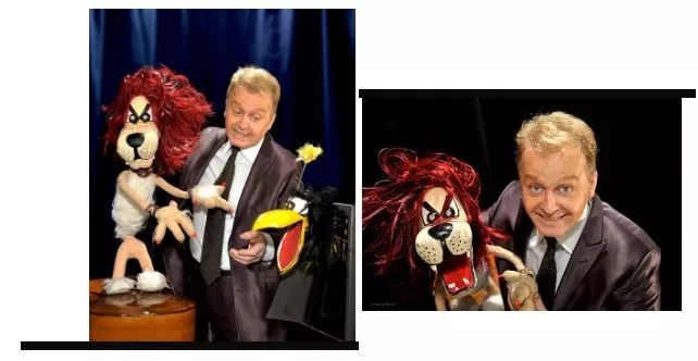 法国腹语大师采取滑稽表演的形式,用一只大提琴好像要演奏,结果琴杆琴弦全部脱落,滑稽场面出现,从琴腹中掏出一只玩具狗来和人对话,变音的狗话用腹音表达,旁边还有一只露头的鸵鸟同样用腹音说话,很吸引观众。