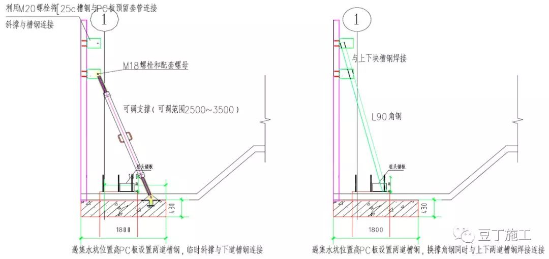 五、换撑在安装固定首块PC板后,由于临时支撑杆件将对后续底板垫层及防水施工造成影响,故需进行换撑作业。具体做法:将2~3块PC板用原临时固定25#C槽钢连成一体,然后用L90角钢一头与一体槽钢连接固定,另一头与桩头钢筋锚板焊接固定,然后拆除临时支撑杆间。