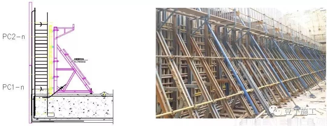 1、严格按照方案要求,将木模板通过螺杆与PC板对拉固定,一头拧入PC板中预埋固定件,一头拉住模板背楞钢管;2、三角撑隔400mm布置,与模板通过勾头螺栓连接,底部通过地埋压固,确保整体体系稳固。3、混凝土浇筑严格按方案要求顺序和速度浇筑,安排专人看模