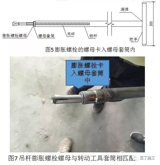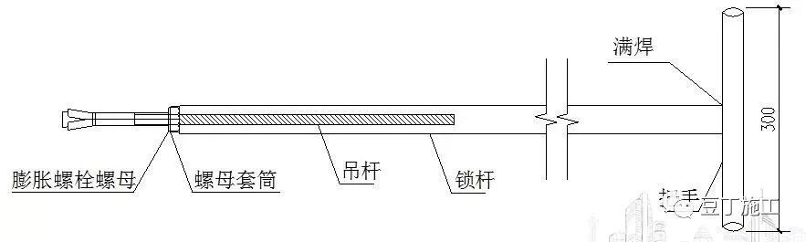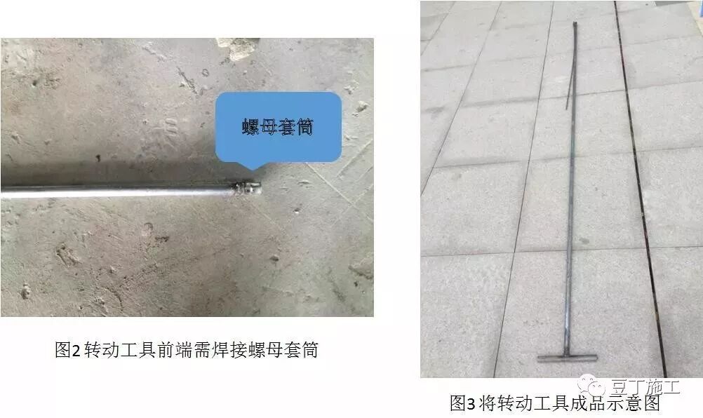 转动工具前端需焊接一个连接筒将螺母套筒和转动工具相连,焊接应满焊,焊缝应饱满,转动工具下方为长度300mm的水平钢管把手,通过焊接与转动工具连在一起。