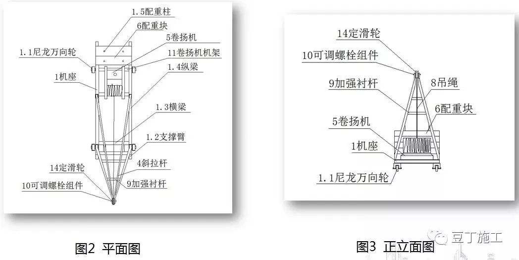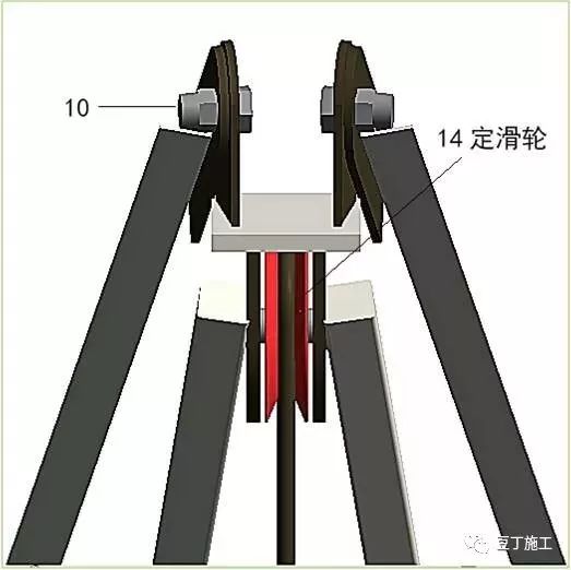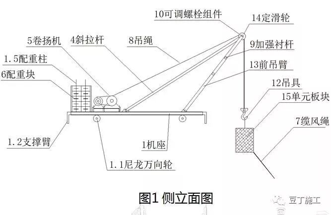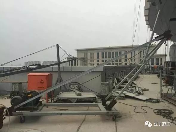 2、将机座放置好,用高强螺栓将机座与斜拉杆和前吊臂连接,高强螺栓必须拧紧。3、连接完成后,用支撑臂将机座支撑起来,避免在吊装过程中吊车出现滑行。4、使用测量仪器对安装完成的活动吊车的水平度进行校核,确保吊车四个脚处于同一水平面。5、将吊绳绕过定滑轮,然后吊钩连接。6、安装完成后,对已完成安装的活动吊车进行验收,验收合格后即可投入对单元板幕墙的吊装使用。