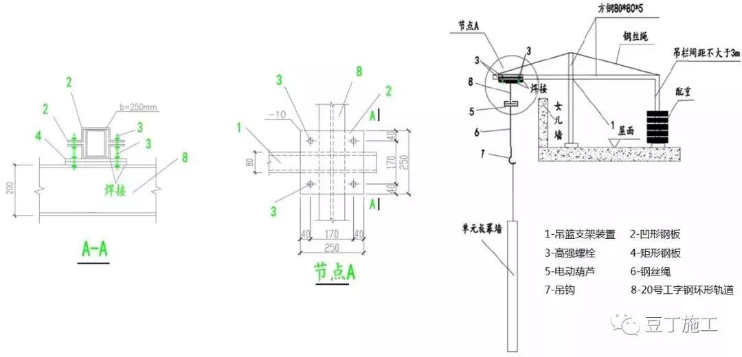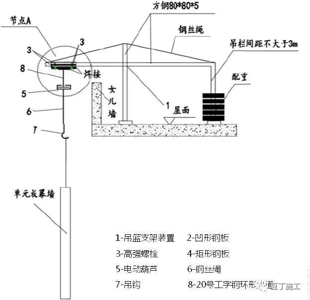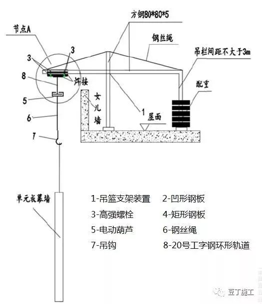 本单元板幕墙安装的吊装装置,主要材料包括20号工字钢环形轨道、电动葫芦、高强螺栓、配套螺母及垫片、钢板、吊篮支架装置。