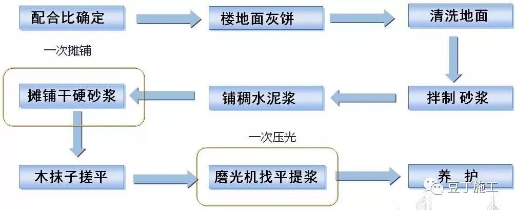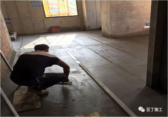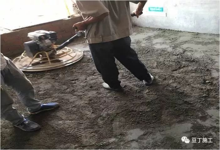 施工操作要点首先按水泥砂子1:3的配合比在搅拌机中对水泥、砂子进行干搅拌,待搅拌均匀后,适量加水继续进行搅拌,使水泥、砂子在手握成团状的潮湿状态后备用;根据经验,判定干硬砂浆的标准为“手握成团,落地成花”的潮湿状态为最好,砂浆太湿或太干都不适合提浆硬化。先做灰饼;提前一天清洗地面,第二天在清洗干净的地面上用较粘稠的水泥浆进行满铺,地面要潮湿但不见明水,水泥浆的厚度保持为30mm—50mm;然后大面积铺设干硬性水泥砂浆,用木抹子拍打搓平;搓平之后马上用磨光机磨光提浆(或多个工人迅速用铁抹子收面),基本不需表面洒水,一直至提浆到位,一次成活,若需毛面,可以用扫把朝一个方向轻扫出纹理;洒水养护:养护时间相对提前。一半来说,夏天 3 小时以后便可以养护,春秋6/7 个小时即可开始养护。不得少于7d。