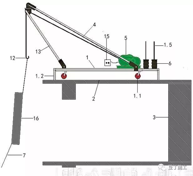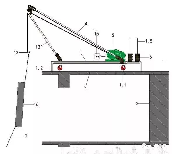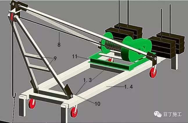 活动吊车组成:包括车身、吊装系统和配重。车身是由尼龙万向轮(1.1)、与尼龙万向轮连接的机座横梁(1.3)、机座竖梁(1.4)、配重端连接的配重铁(6)、配重柱(1.5)组成。特征:机座(1)放置于靠近建筑物的边缘位置,机座前端设置活动支撑臂(1.2),在吊装时放下,稳定吊车。