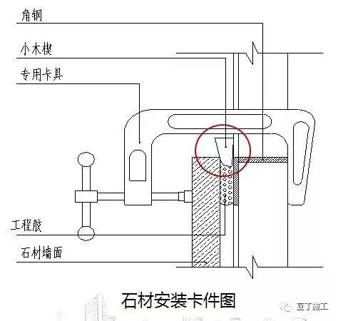 用专用卡具和小木楔临时固定和调节石材板面,钢架与饰面板之间用胶厚度宜控制在4~5mm。